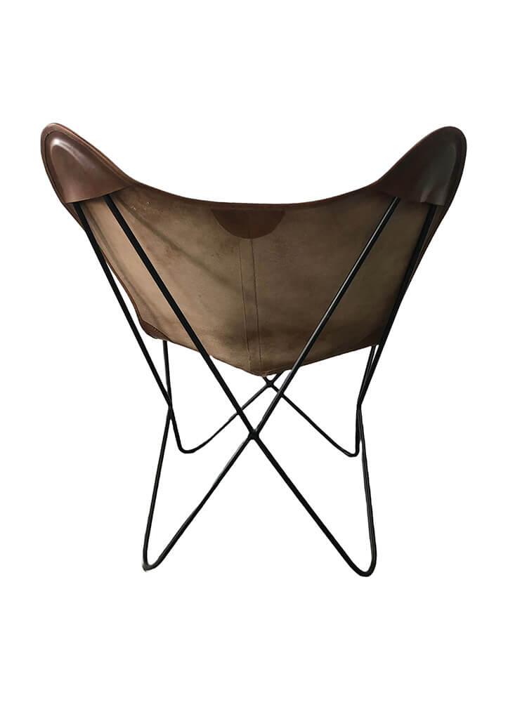 Loungestolen leveres i to dele: Understellet er fremstillet i sortmalet jern med små synlige svejsninger, og bøffellæderbetrækket i en lækker brun farve kommer i en separat æske, klar til at sætte på.