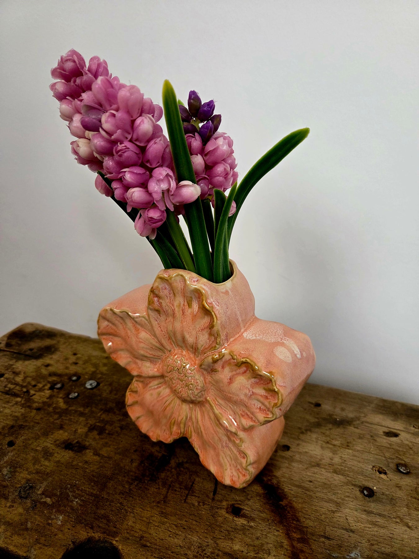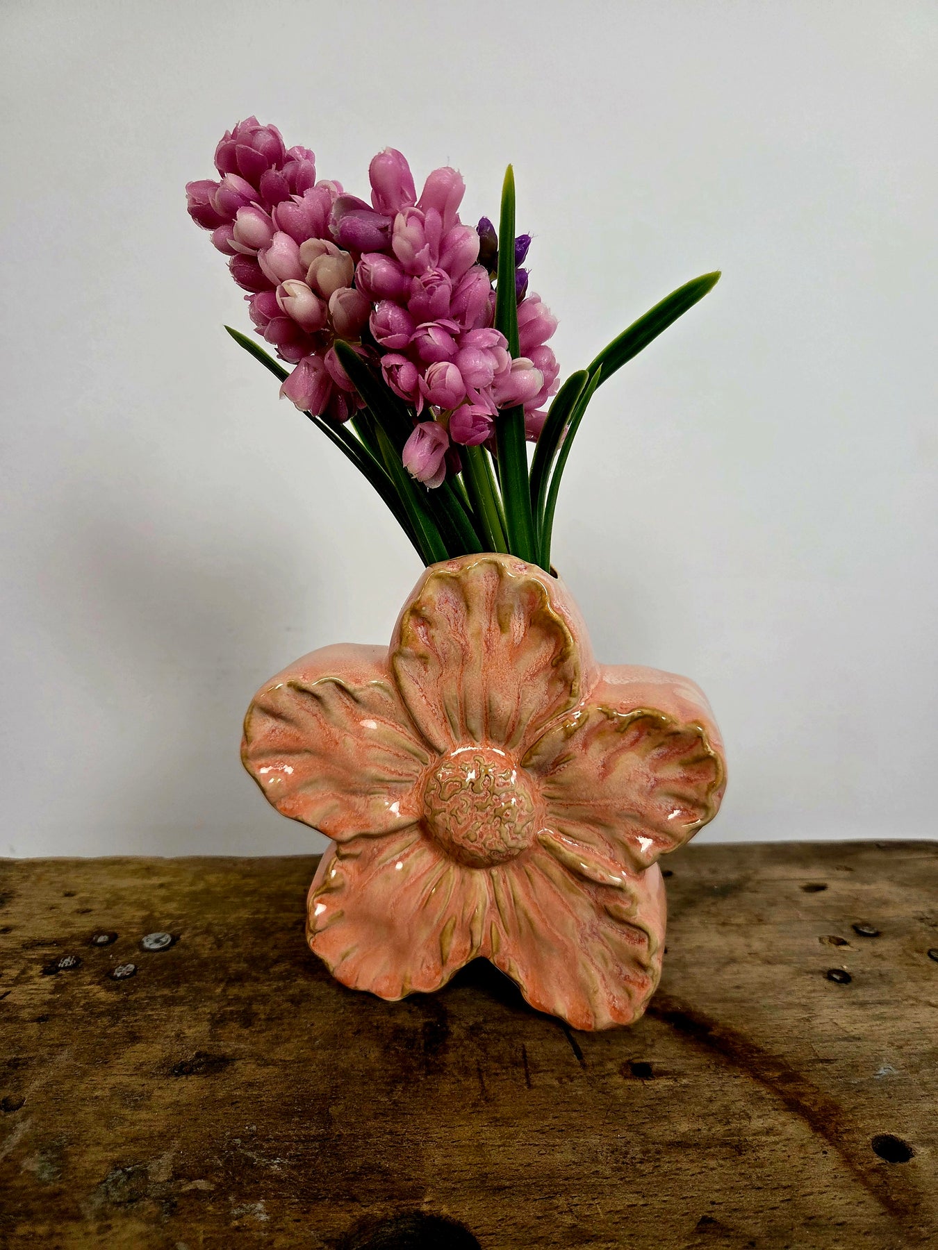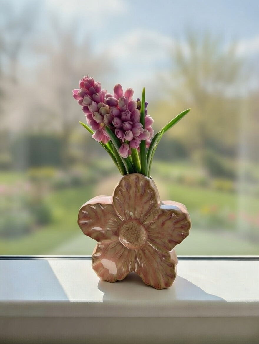Smuk lille vase formet som en delikat blomst i blød, lyserød keramik med fin glasur og let tekstur. Den har en charmerende, organisk form med bløde kronblade og en praktisk åbning til friske blomster eller grene. Perfekt til en enkelt hyacint, narcisser, tulipaner eller små buketter – giver straks forårsstemning på bordet, vindueskarmen, hylden eller natbordet.