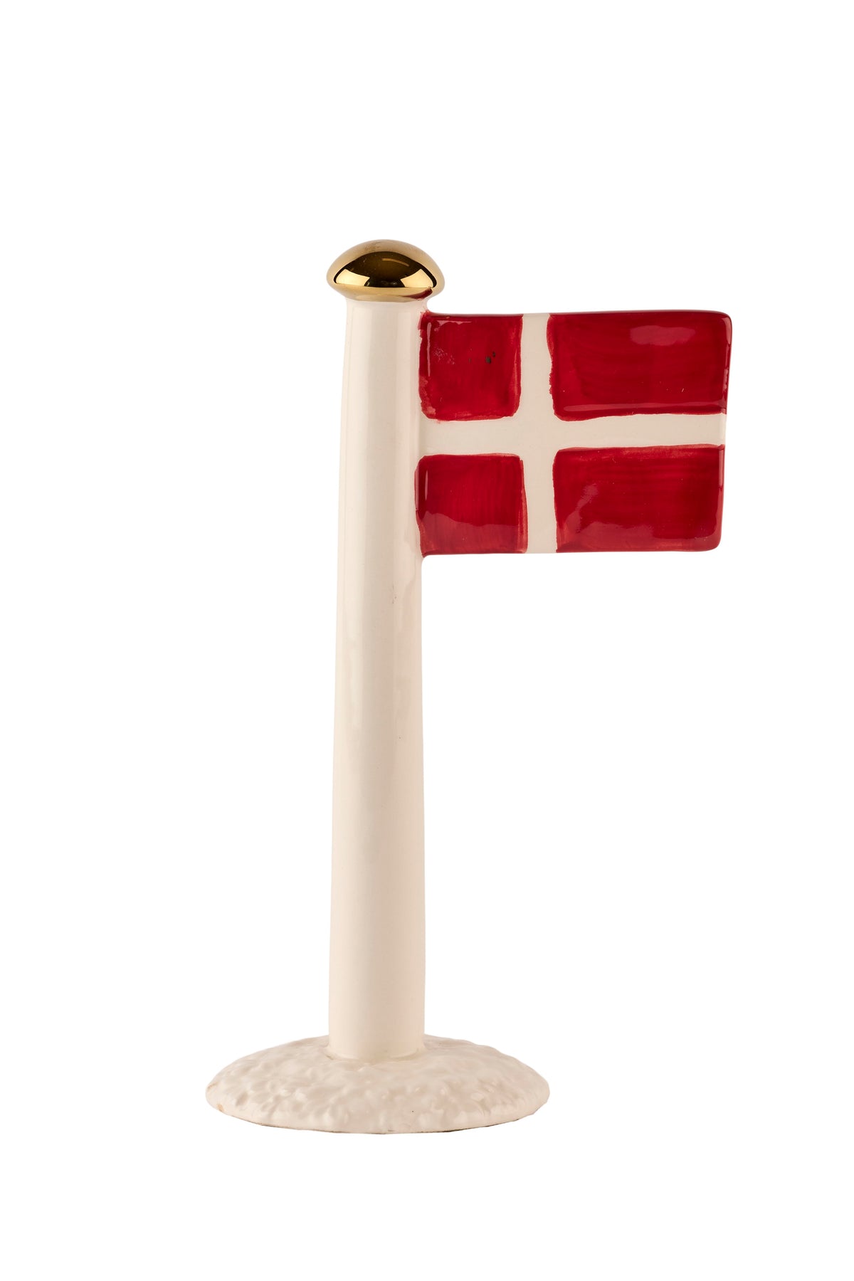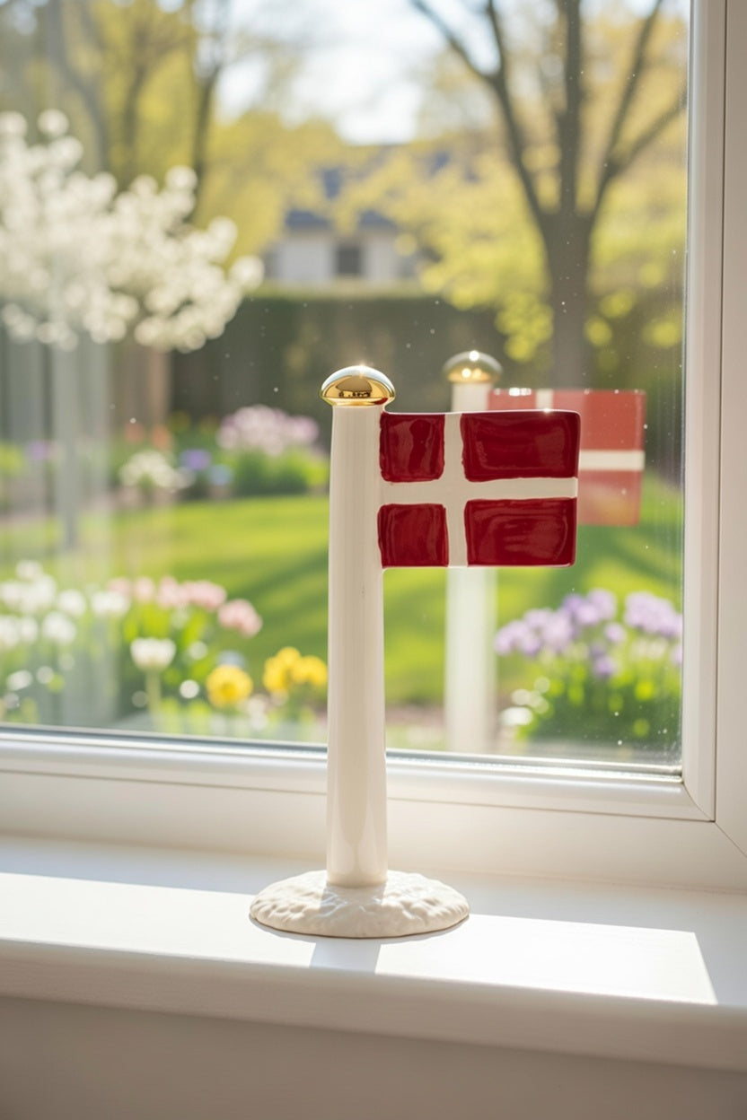 Disse flag i keramik har en elegant, hvid stang med forgyldt kugle øverst og et klassisk rødt Dannebrog-flag med hvidt kors. Hvert flag står stabilt på en lille, dekorativ rund base med smukke blomstermotiver i enten frisk blå, varm coral eller ren hvid nuance – så du kan matche dem til din personlige stil, borddækning eller indretning.