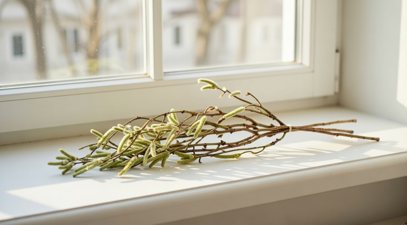 Naturtro kunstig gren med fine, bløde grønne rakler, der giver et frisk og forårsagtigt udtryk. Den lange gren efterligner en klassisk birke- eller pilegren med rakler og er perfekt til at skabe højde og lethed i dekorationer året rundt.