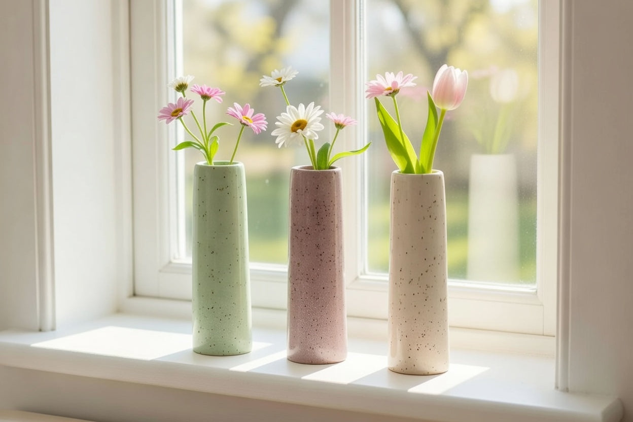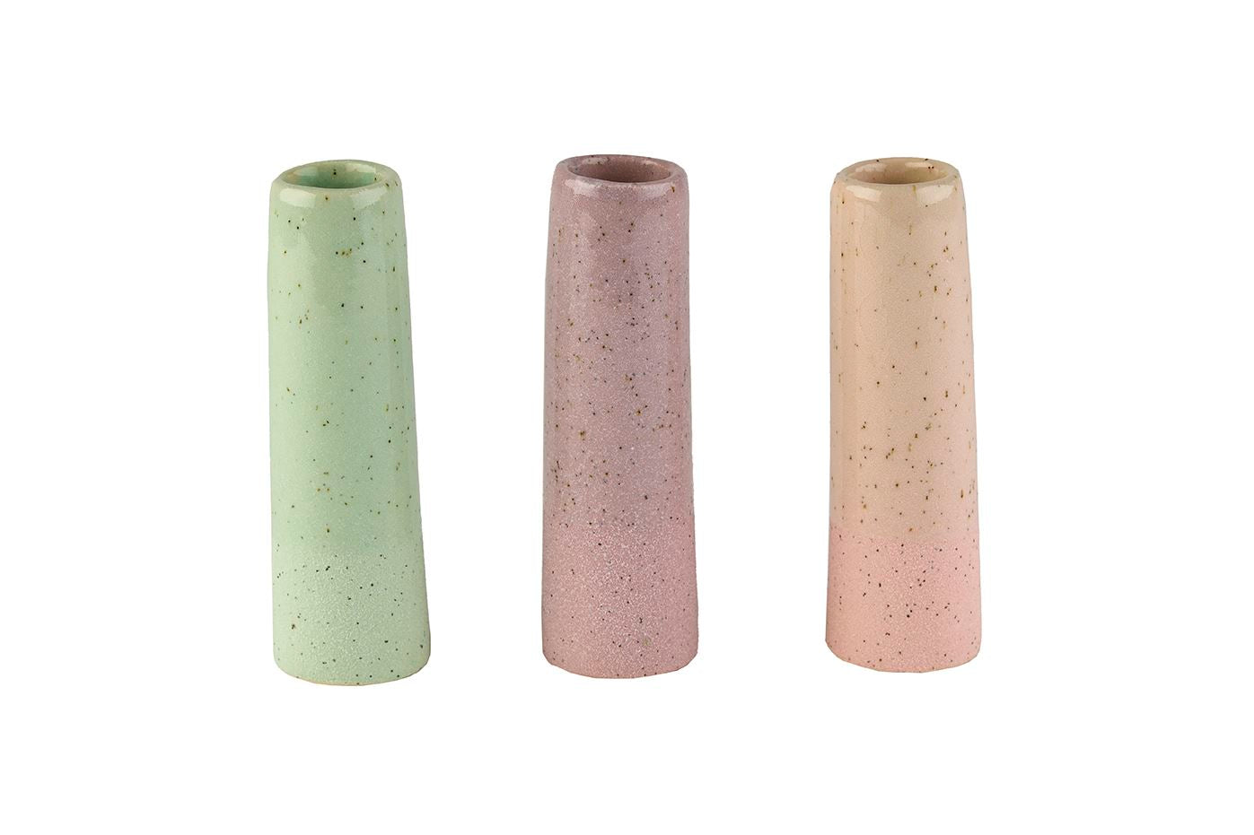 Disse små vaser er ideelle til enkelte stilke, vilde blomster, tørrede græsser eller som fine dekorative elementer på vindueskarmen, reolen, spisebordet eller natbordet. De kan bruges enkeltvis for et underspillet look eller sammen som en trio for mere dynamik og farvespil. Deres slanke, høje cylindriske form gør dem tidløse og alsidige i ethvert hjem.