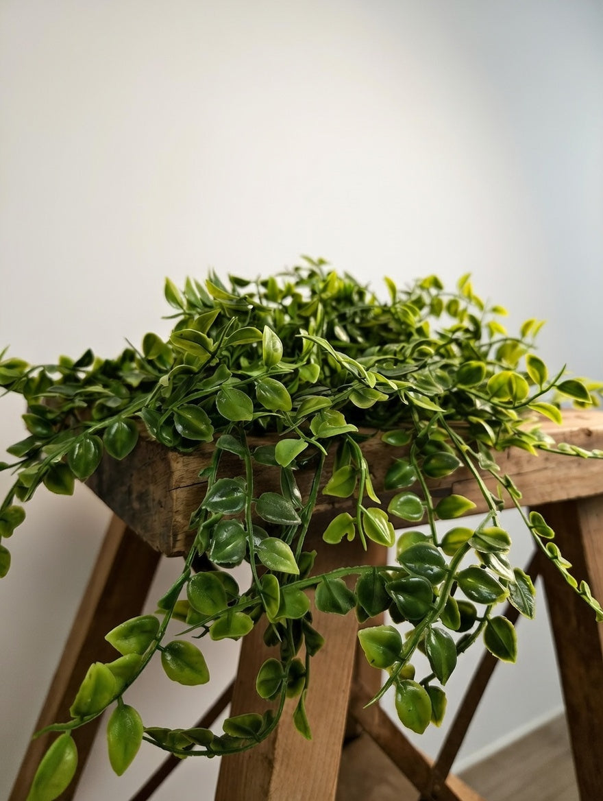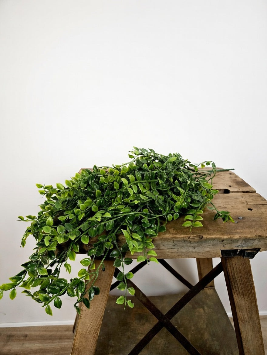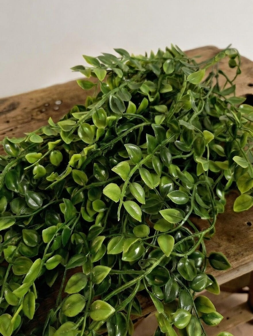 Skab liv og friskhed i rummet med denne realistiske hængeplante på lang stilk. De små, runde, dybgrønne blade sidder tæt på de fleksible ranker, der naturligt falder smukt ned – perfekt til at hænge fra loft, hylde, vindueskarm eller i en macramé-holder.