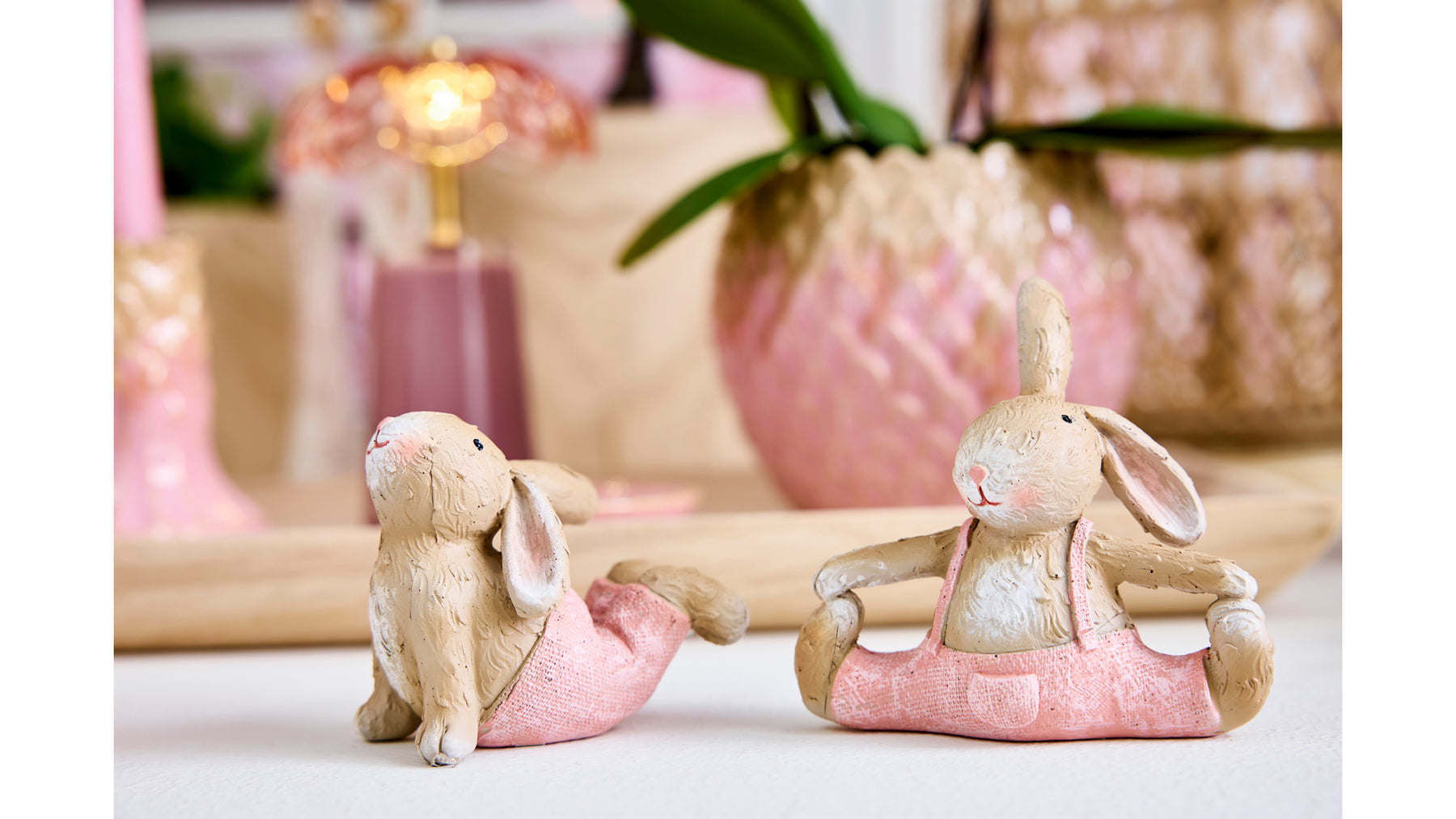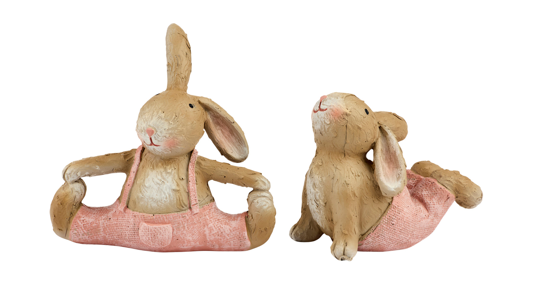 Skab en hyggelig og legende stemning i dit hjem med dette charmerende sæt af to kaninfigurer. De søde kaniner er udformet i afslappede yogapositioner og iført fine lyserøde detaljer, som giver dem et blødt og varmt udtryk.