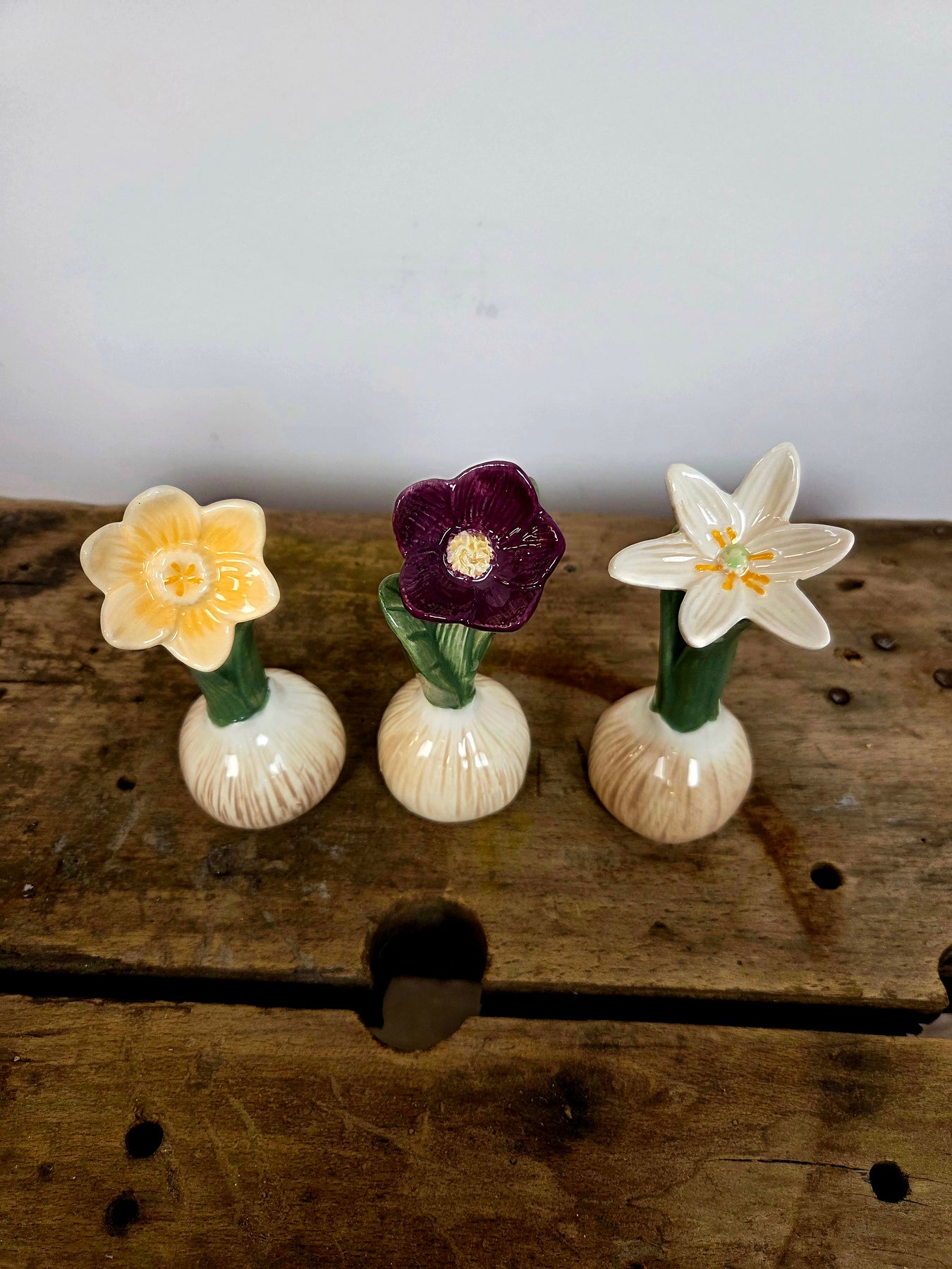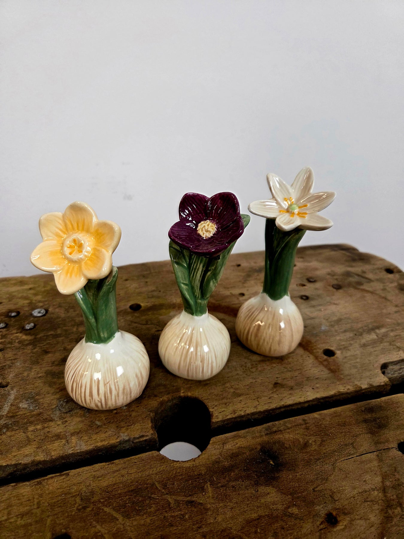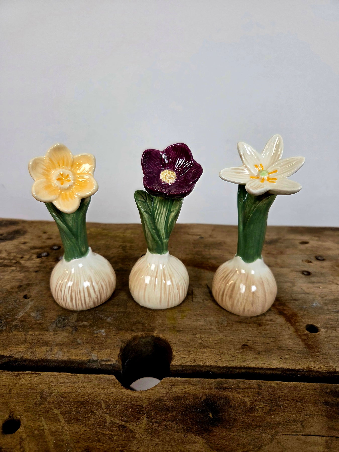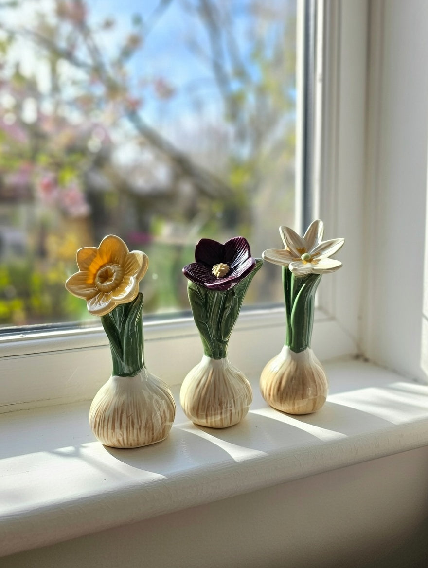 Dette fine sæt af 3 keramiske forårsblomster, bringer forårsstemning og hyggelig nostalgi ind i hjemmet. Hver lille blomst er formet som en sprudlende blomst, der skyder op fra en realistisk løgformet krukke i rustik, patineret beige/brun keramik med grønne blade, der folder sig elegant ud. Blomsterne kommer i tre skønne farver – perfekt til at skabe variation og harmoni. De små størrelser gør dem ideelle til vindueskarmen, reolen, påske- eller forårsbordet, natbordet, badeværelset eller som sød gaveidé. De tåler støv og holder farven år efter år – ingen vanding, ingen visne blade, kun ren dekoration og charme.