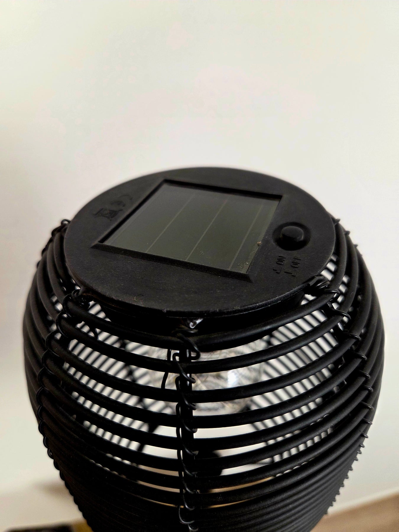 Solpanel på toppen lader op i dagslys, og lanternen tænder automatisk om aftenen med op til 6 timers lys. Rustikt industrielt look, der passer både til moderne og naturnære haver.
