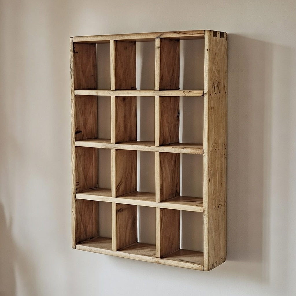 - Egenskaber: 12 rum, kan hænges op lodret eller vandret og leveres med små beslag. Rummene måler ca. 13cm x 13,5cm, men kan variere en smule, da hver reol er unik.