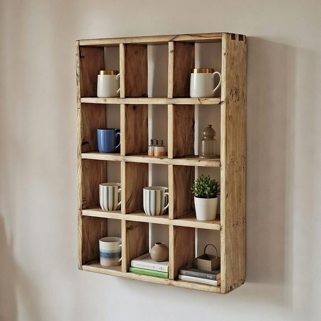 Denne elegante kopreol i genanvendt træ kombinerer funktionalitet med et naturligt, rustikt udtryk. Med 12 rummelige sektioner i en solid træramme giver den mulighed for at organisere og udstille krus, små flasker eller dekorationer på en stilfuld måde. Reolen kan hænges op både lodret og vandret, hvilket giver fleksibilitet til at tilpasse den til dit rum og din indretning. Den naturlige træfinish og den enkle konstruktion gør den velegnet til både køkkenet, caféen, butikken eller kontoret. Uanset hvor du placerer den, tilfører denne kopreol varme og struktur til din indretning.