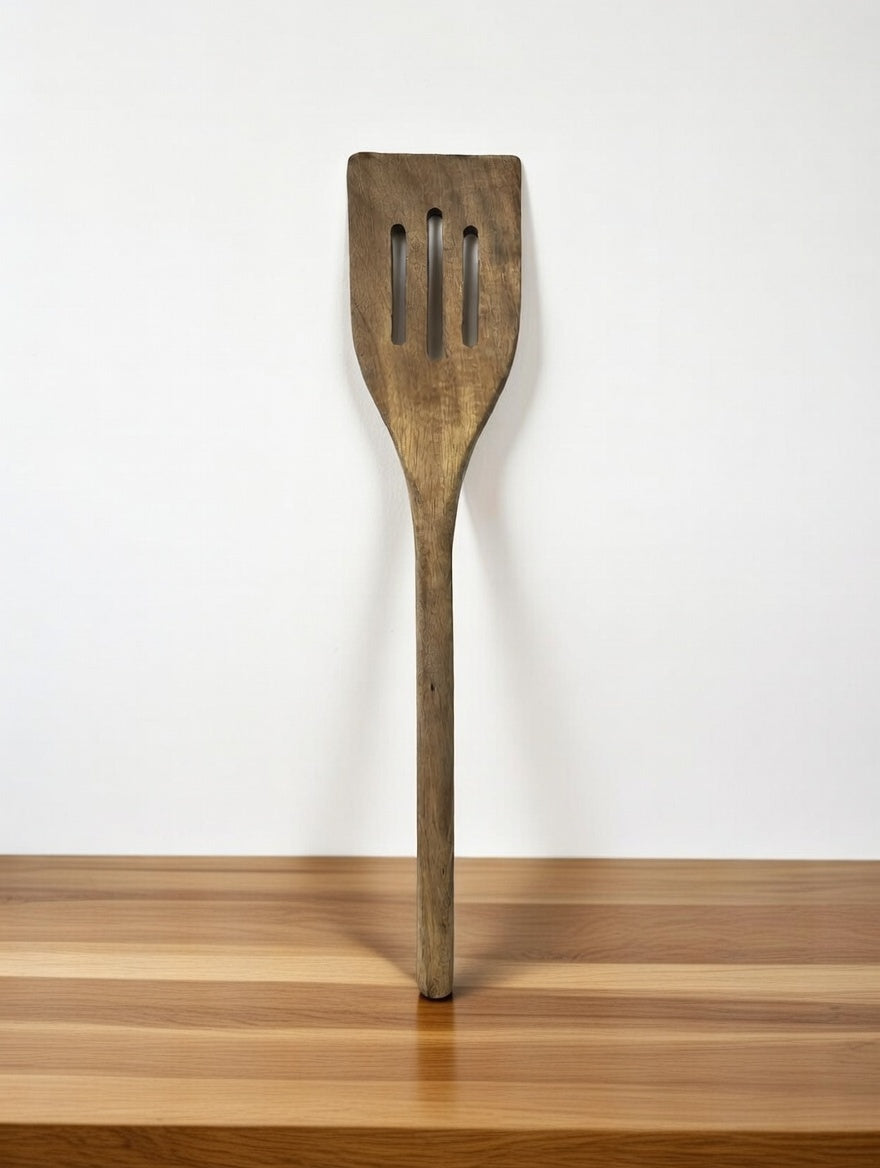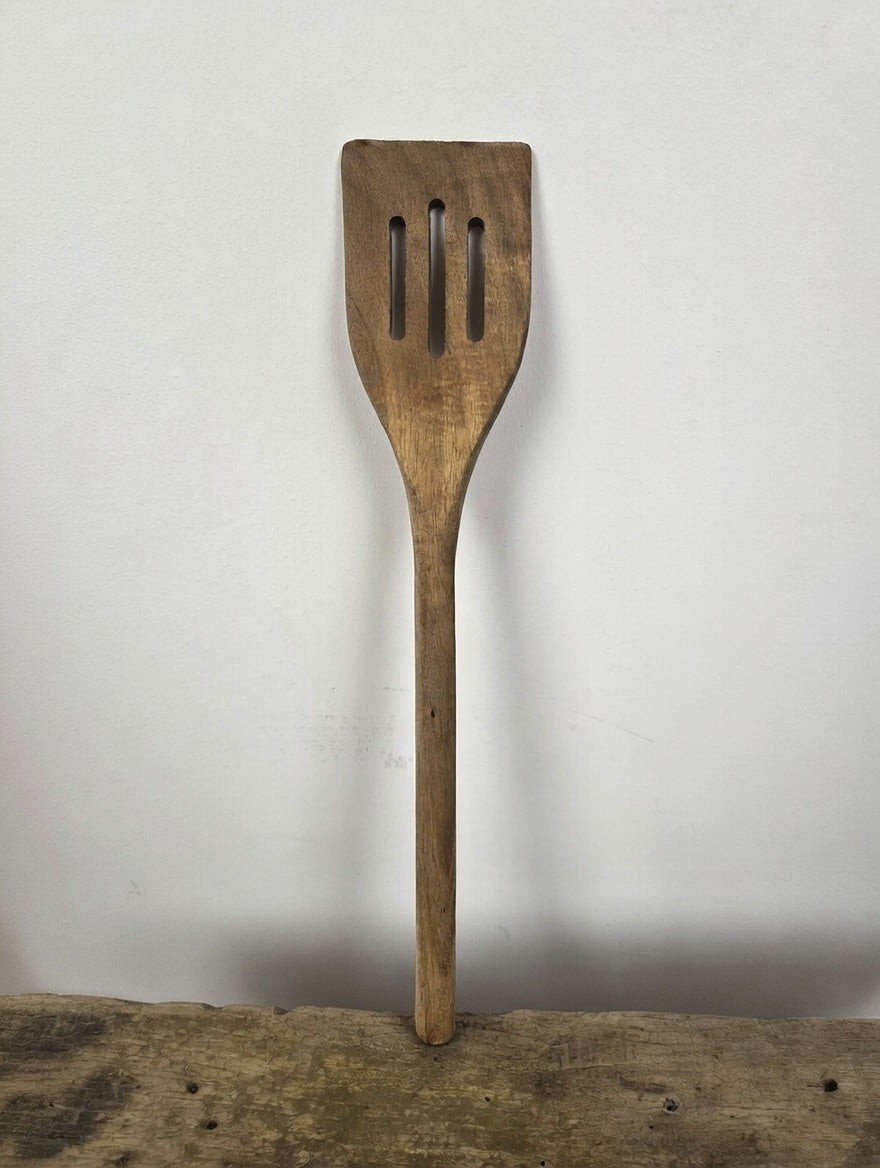 Palet i træ – ca. 32 cm Praktisk palet i naturligt træ med tre åbninger til at dræne væske. 32 cm lang med godt greb og bredt blad. Ideel til at vende steg, fiske, pandekager eller grillede grøntsager – lader overskydende olie eller marinade løbe fra.