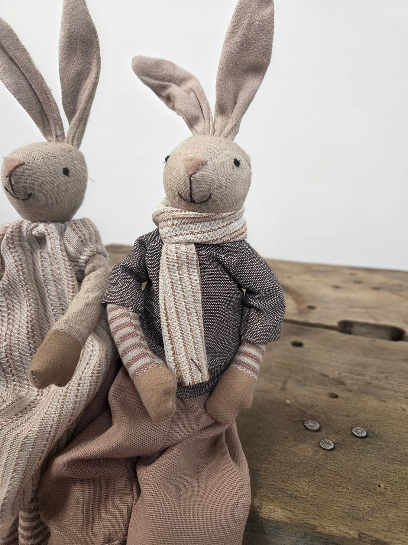 Dreng-haren er klædt i en gråbrun bukse og en stribet skjorte i samme farvefamilie, toppet med et blødt, stribet tørklæde i beige og brunt rundt om halsen. Også han har lange ører, søde broderede øjne og en charmerende lille mund.
