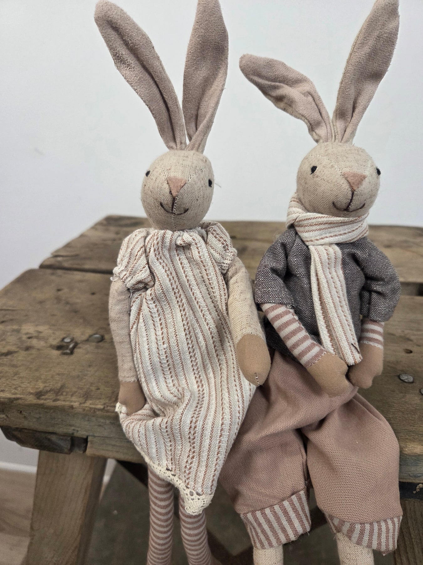 Begge har lange, tynde ben i stribet stof og små beige fødder, der giver dem et afslappet og hyggeligt udtryk, når de sidder. De er perfekte som dekorative elementer på en hylde, i vindueskarmen, på et sidebord eller som en sød påskeopstilling sammen med grene, æg og forårsblomster. De kan også bruges som en blød krammer for børn eller som en fin gave til påsken.