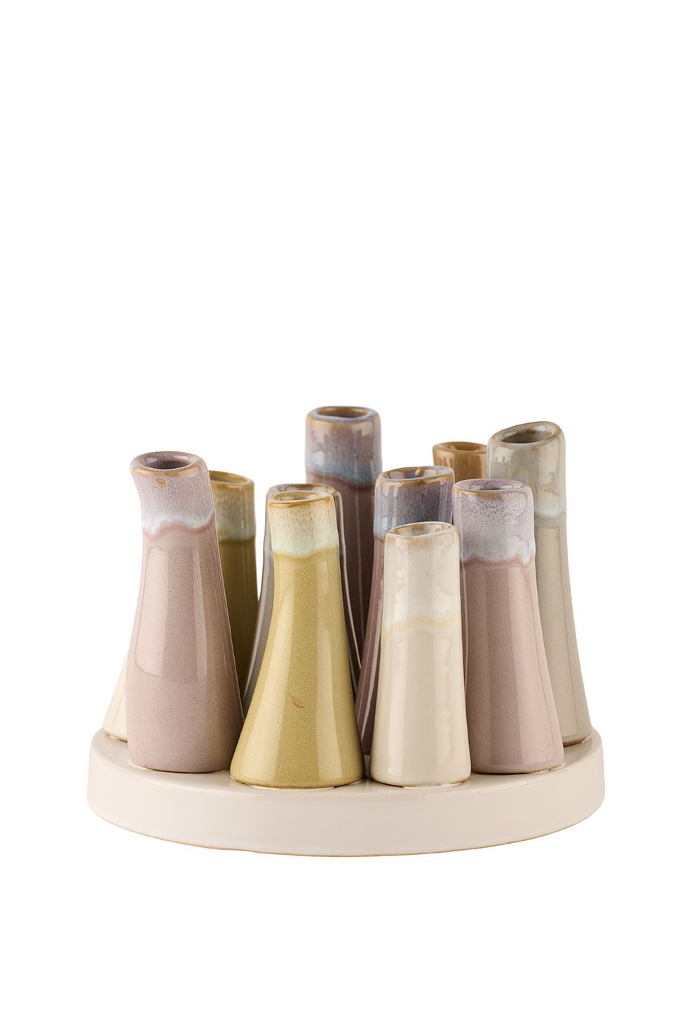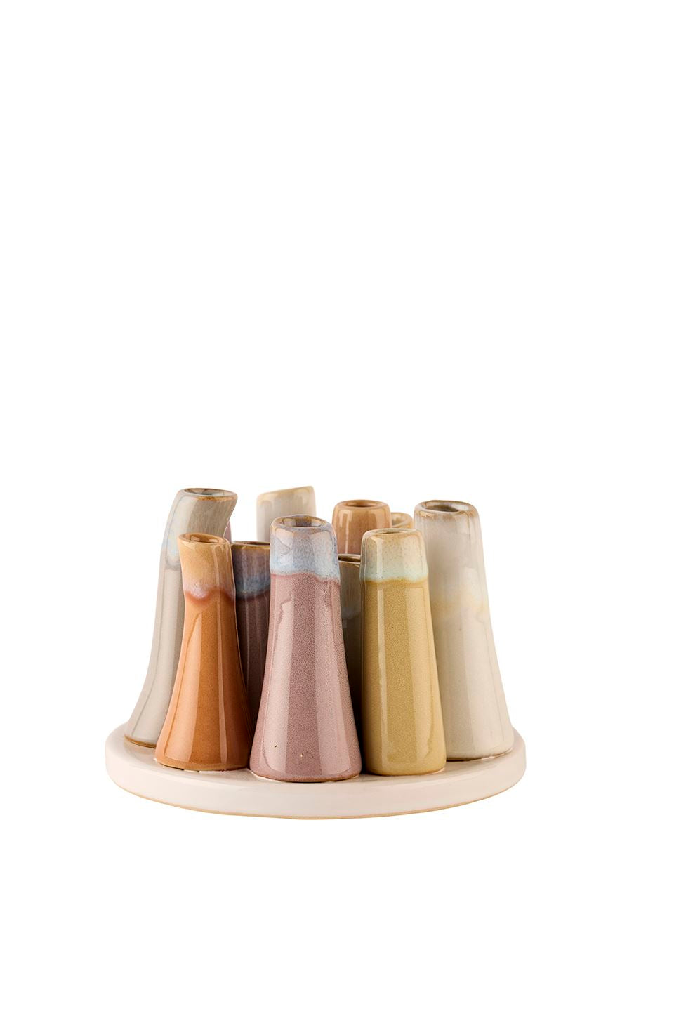 Disse små vaser i keramik er en fin og afdæmpet måde at bringe lidt organisk hygge ind i hjemmet. De står samlet på en rund base og har hver deres unikke, glaserede overflade i bløde jordfarver – fra varme beige og taupe til støvede rosa, gyldne toner og sarte blågrå nuancer. De let buede, kegleformede vaser giver et naturligt, håndlavet udtryk, der passer perfekt til både minimalistisk og nordisk indretning.