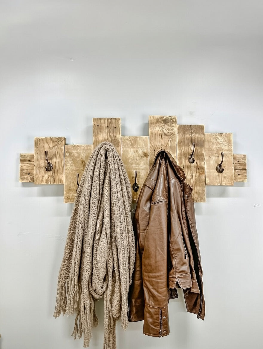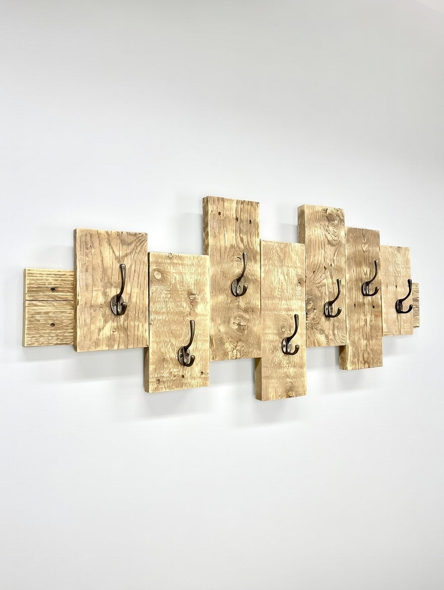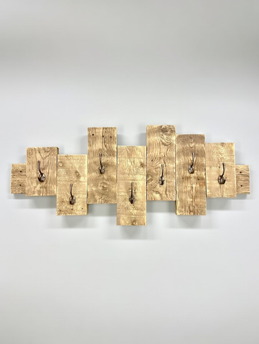 Knagerække af smukke knager i børstet stål på slebet genbrugstræ. Kan bruges mange steder i hjemmet og passer godt i den moderne, nordiske indretning. Brug den for eksempel som ophæng til tøj og jakker.