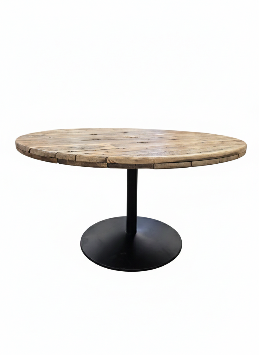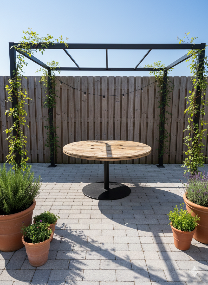 Drømmer du om en terrasse med personlighed? Vores havebord af originale kabeltromleplader forener industrielt genbrugstræ med et moderne centerstel. Det er ikke bare et bord – det er et stykke historie, der inviterer til nærvær og hyggelige stunder under åben himmel.