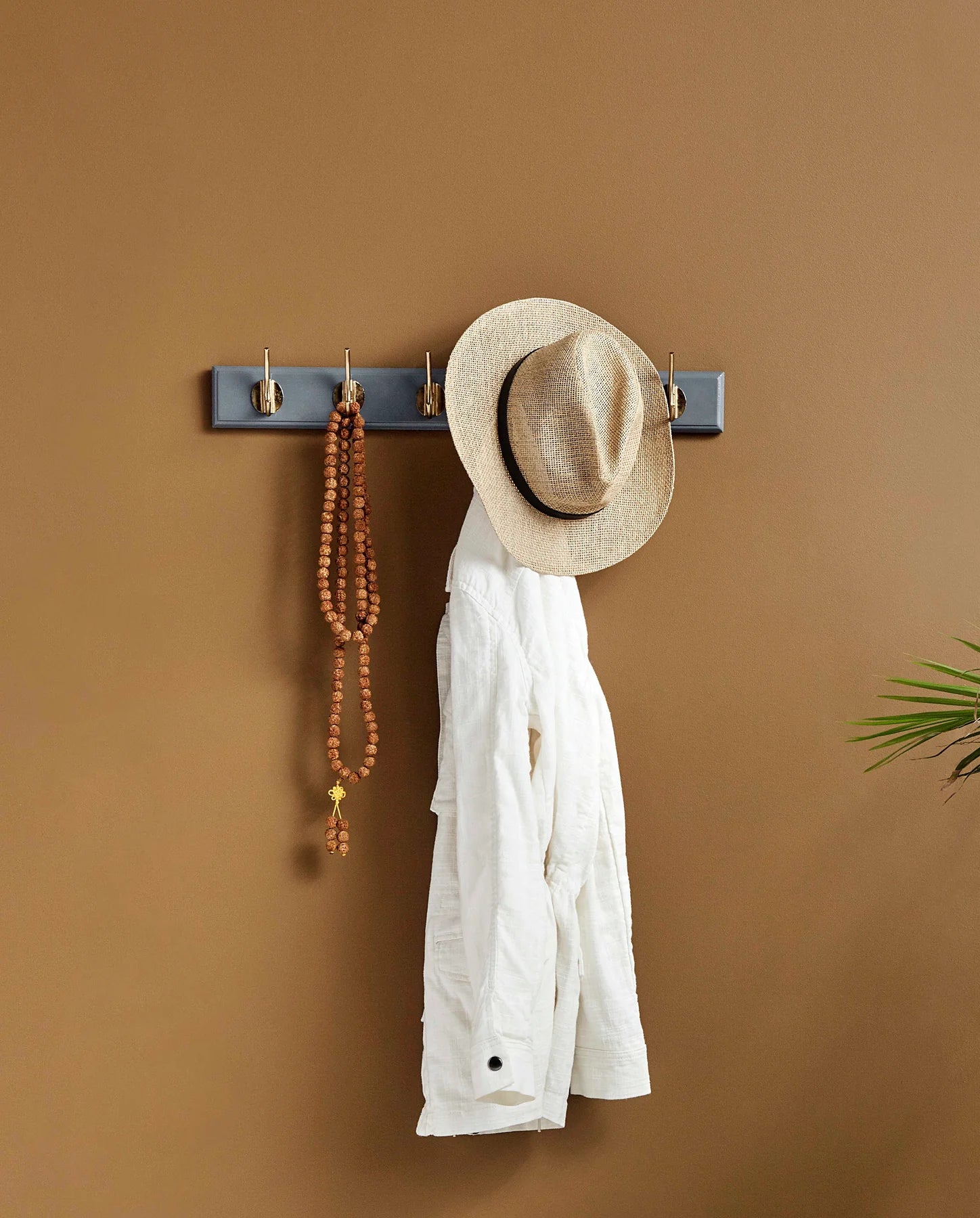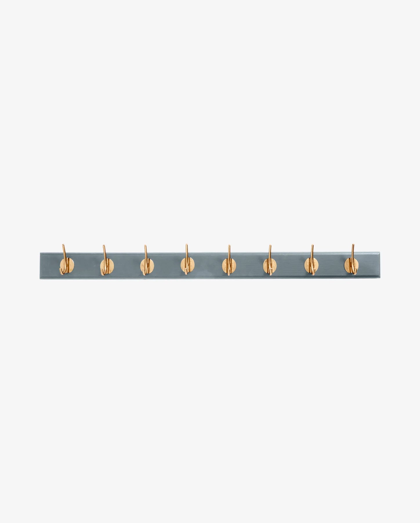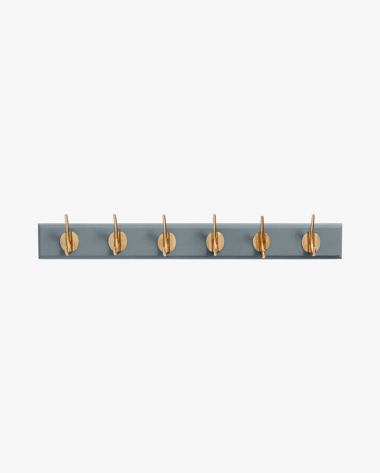 EDGY knagerække i træ med messing knager. Flot grå knagerække med fine messing knager på et profileret træbrædt. En praktisk knagerække med et elegant og eksklusivt look. Kan både bruges til jakker i entrén eller til pyntegenstande.
