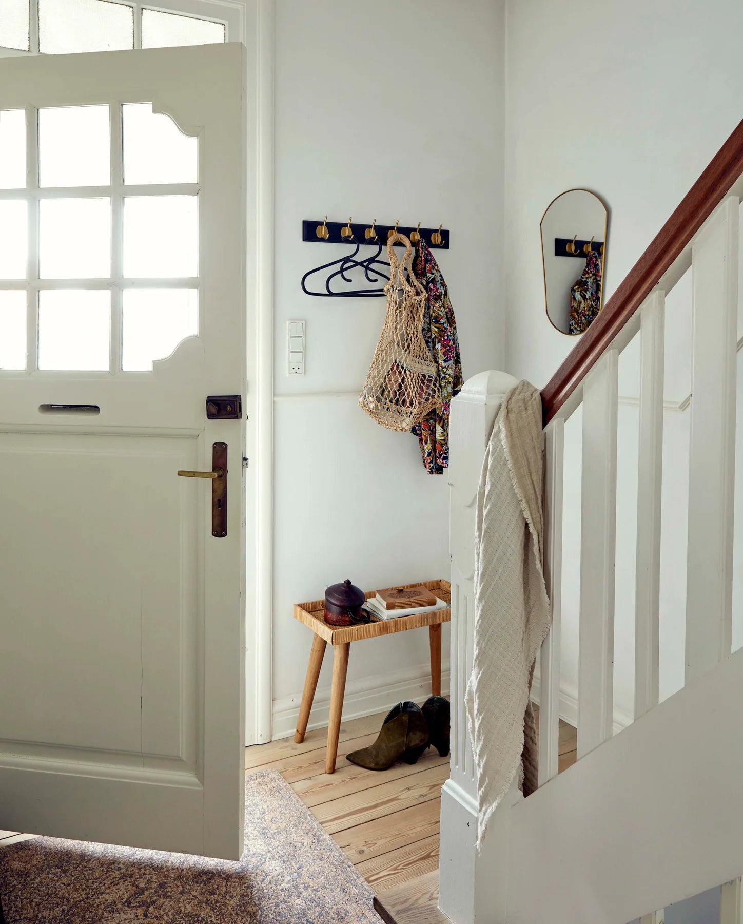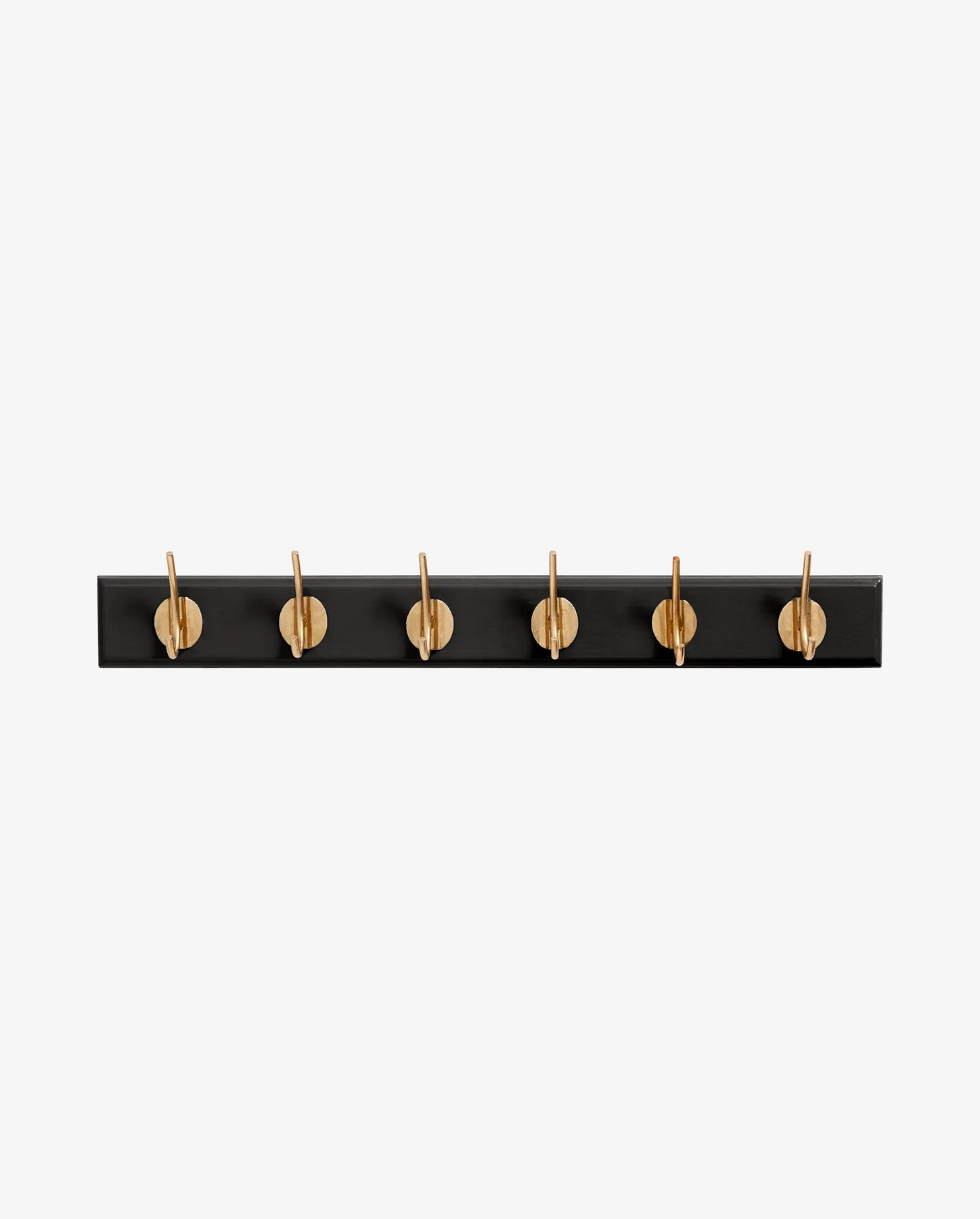 EDGY knagerække i træ med messing knager. Flot sort knagerække med fine messing knager på et profileret træbrædt. En praktisk knagerække med et elegant og eksklusivt look. Kan både bruges til jakker i entrén eller til pyntegenstande.
