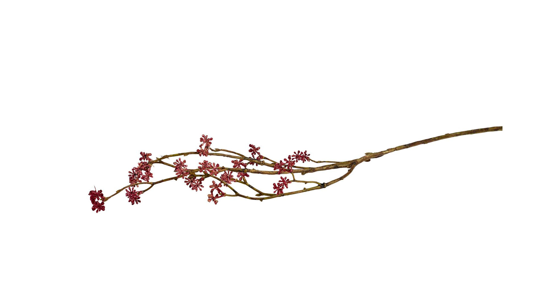 Denne elegante dekorationsgren i bordeaux er en kunstig gren med fine, små bordeaux-farvede blomsterklaser (små stjerneformede blomster samlet i klaser langs de naturligt buede grene). Den giver et rustikt, organisk og sofistikeret udtryk, der minder om tørrede eller vinterlige bærgrene. Grenen er perfekt til at tilføje dybde, farve og efterårs- eller vinterstemning til dit hjem – uden at visne eller kræve pleje. Brug den i høje vaser, som solitær på et sidebord, i krukker ved entréen, som del af borddekorationer, i jule- eller påskearrangementer, eller sammen med andre grene og blomster for et større, lagdelt look. Den bordeaux farve tilføjer varme, elegance og et touch af luksus til enhver indretning.