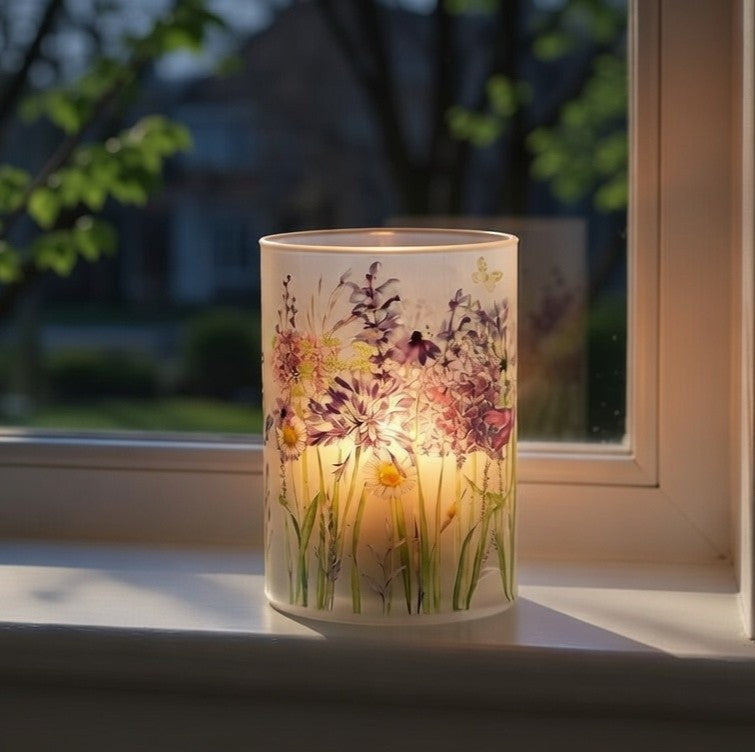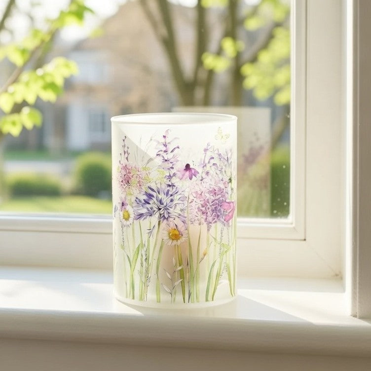 Dekorativ cylinderformet glaslampe i mat/frostet glas med trykt blomstermotiv i pastelfarver (lavendel, lilla, rosa og grønne toner) samt små guld-sommerfugle. Inde i glasset sidder varme LED-lys, der giver et blødt, dæmpet lys gennem motivet.