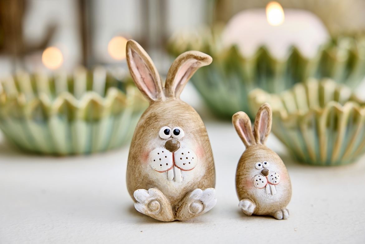 Søde, håndmalede små kaniner i æggeform med charmerende udtryk. De er lavet i keramik med en varm, brun-beige patina, store runde øjne, prikkede kinder og de klassiske lange ører – perfekte til påskebordet, vindueskarmen, hylden eller som lille hyggelig dekoration året rundt.