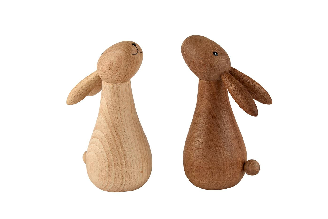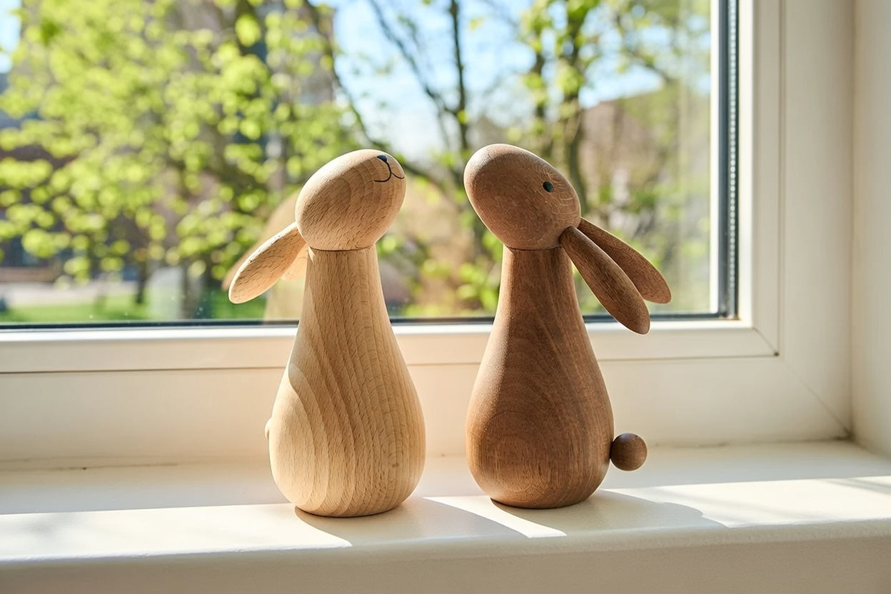 Denne elegante og minimalistiske kanin i massivt træ er et tidløst stykke håndværk, der tilføjer naturlig varme og skandinavisk charme til enhver indretning. Den simple, afrundede form med lange ører, små sorte øjne og et sødt, stregtegnet smil giver kaninen et venligt og legende udtryk – uden overflødige detaljer. Den høje, dråbeformede krop slutter i en lille rund hale, og det fine træs arbejde fremhæver årernes smukke mønster. Vælg mellem det lyse, naturlige bøgetræ med bløde, gyldne toner eller det mørkere, dybe mahogni med rødlige nuancer – begge varianter passer perfekt til moderne, nordisk eller rustik stil. Placer den på vindueskarmen, reolen, sidebordet, påskebordet eller som en del af en større dekoration. Den er også en skøn, personlig gave til fødselsdage, påske, baby shower eller bare fordi – en lille kanin, der bringer smil året rundt.