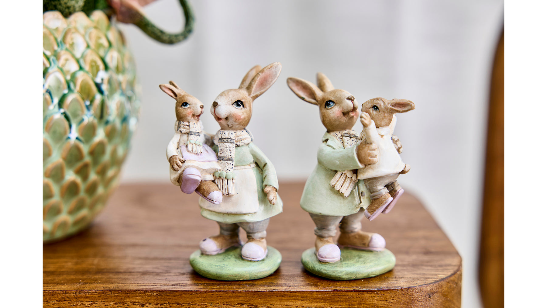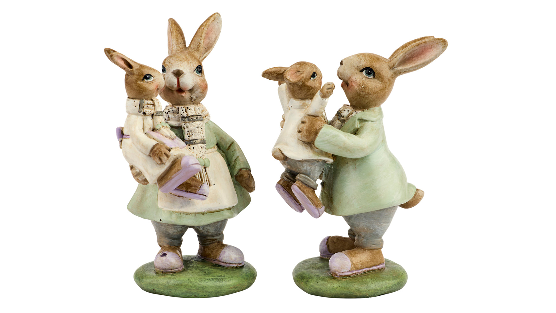 Dette fine sæt med to dekorative kaninfigurer forestiller en sød kaninfamilie og emmer af varme, omsorg og hygge. Figurerne er udført i bløde grønne og naturlige nuancer med fine detaljer, som giver dem et charmerende og levende udtryk.