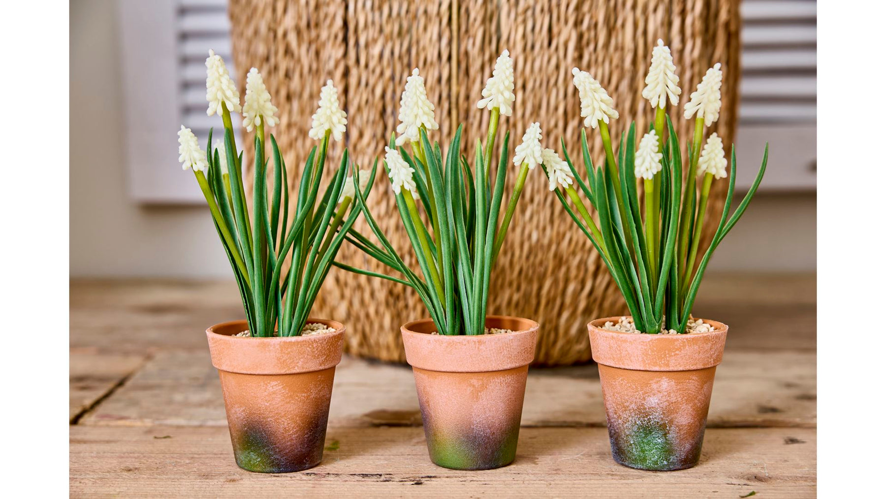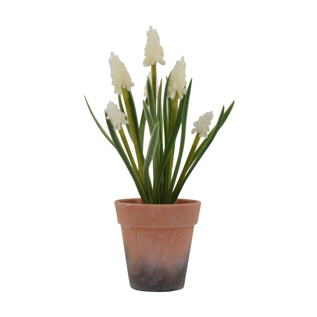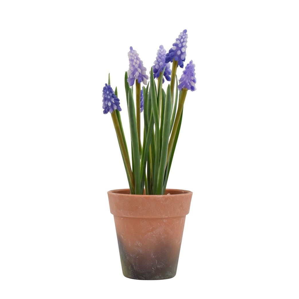 Smuk, realistisk efterligning af en forårsfrisk perlehyacint i en lille, rustik terrakotta-pot. Blomsterne har de karakteristiske tætte, perleformede klokker på fine, grønne stængler – perfekt til at bringe forårstemning ind i hjemmet hele året uden vanding eller visnen.