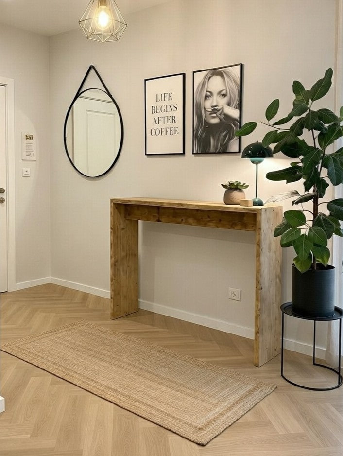 Dette rustikke Konsolbord er håndlavet, i Danmark, af genbrugsplanker fra byggeindustrien Træets naturlige patina giver møblet en helt særlig historie og charme som giver et rustikt pust til hjemmet og den nordiske indretning.