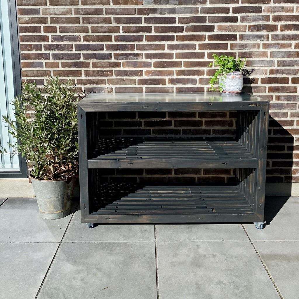 Lækker reol af traller, der kan bruges som afsætningsbord i udekøkkenet eller placer en lille gasgrill på bordet og brug det som grillbord. Hylden under bordet giver praktisk opbevaringsplads når man griller. Kan også bruges som plantebord på terrassen eller noget helt andet.