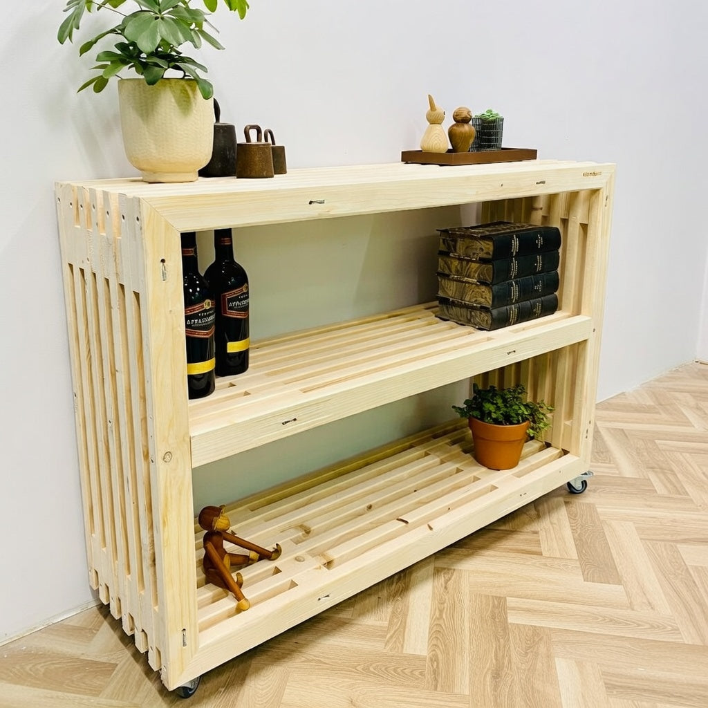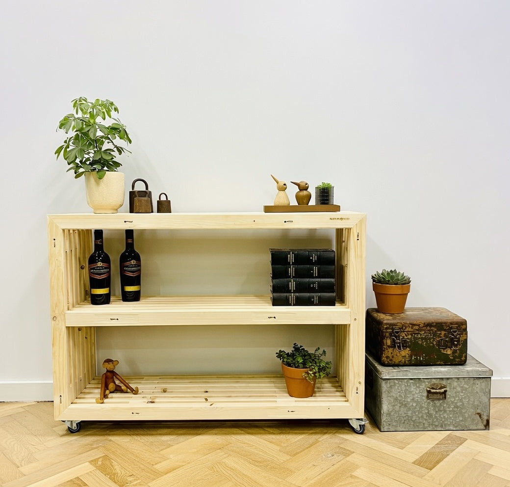 Giv dit hjem, kontor eller café et stilrent og moderne løft med denne håndlavede reol, bygget af originale traller. Det lyse, rene grantræ giver et flot, naturligt look med masser af karakter – knaster, små variationer i træet og den ægte træstruktur skaber et råt og autentisk udtryk, uden den mørke patina fra brugte traller.