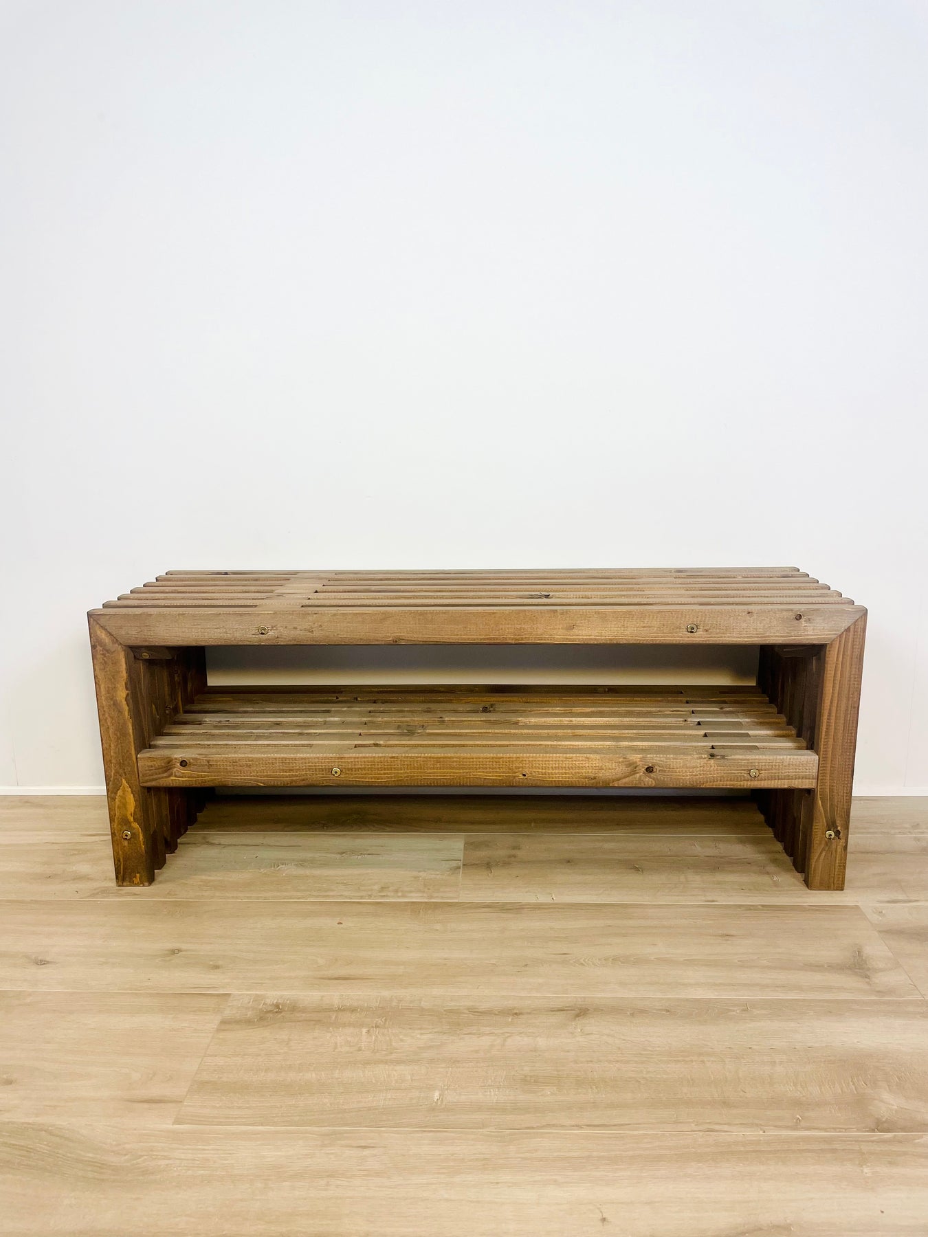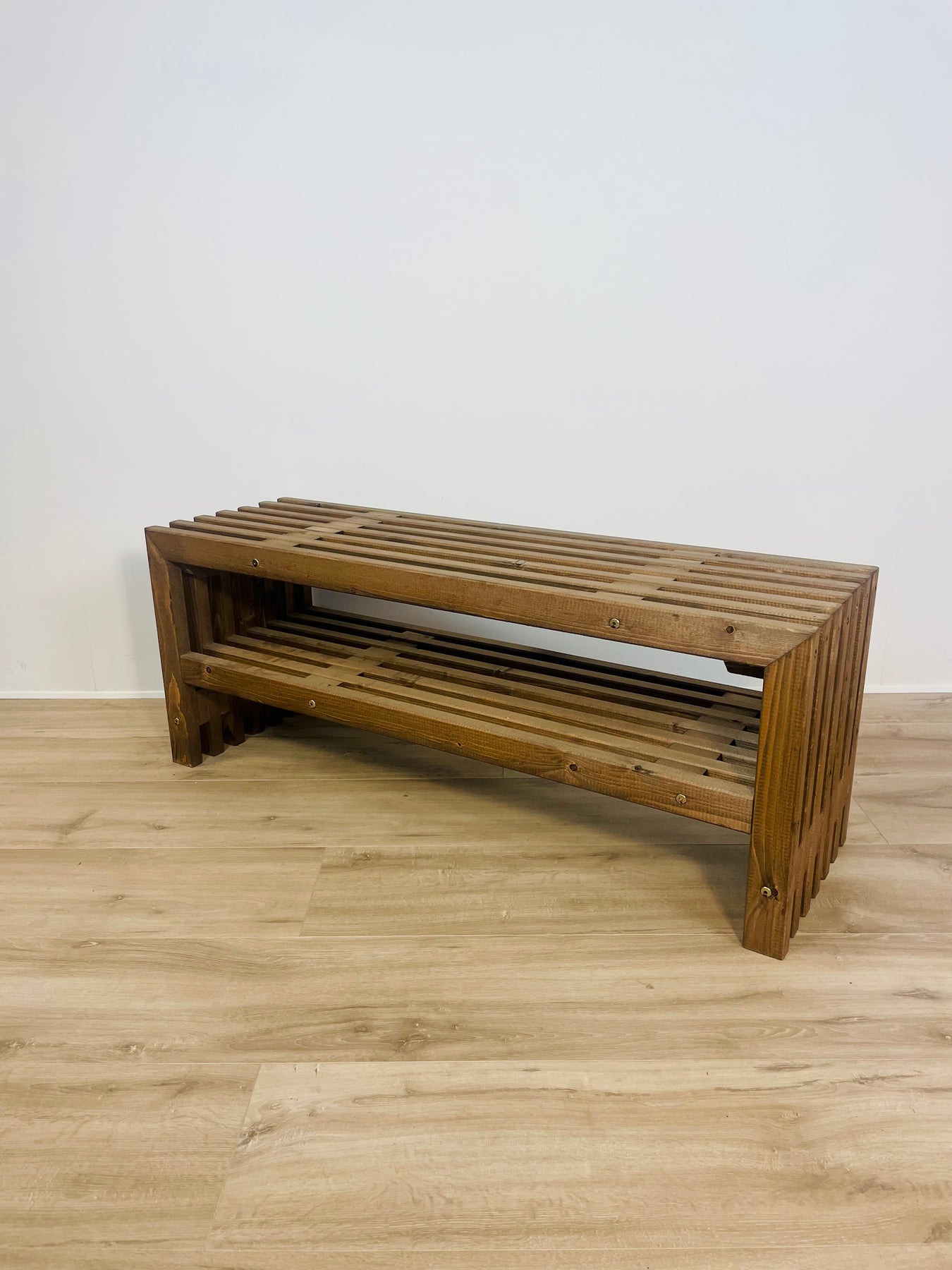 Dette stilrene TV-bord er håndbygget i Danmark af rigtige traller i massivt træ. Overfladen er behandlet med brun bejdse, som fremhæver trallernes karakteristiske, lodrette liste-udtryk og giver et moderne, grafisk look med rå elegance.