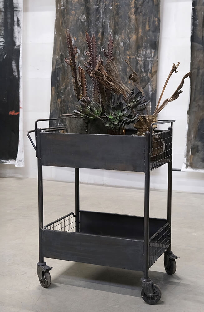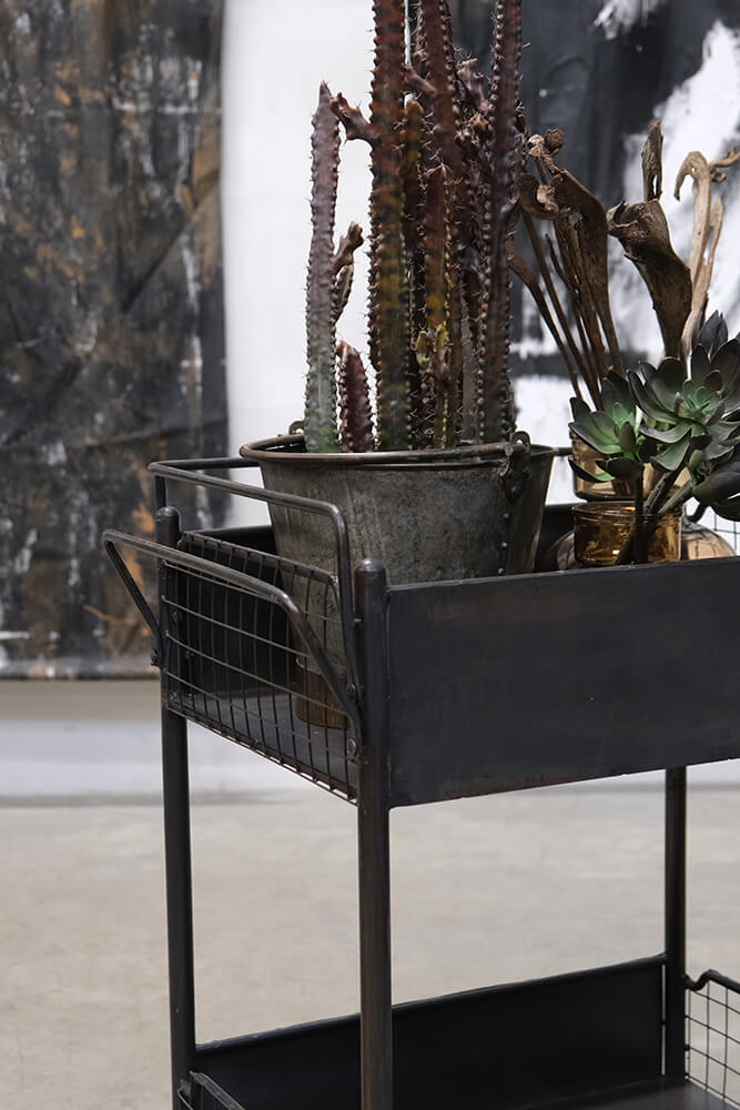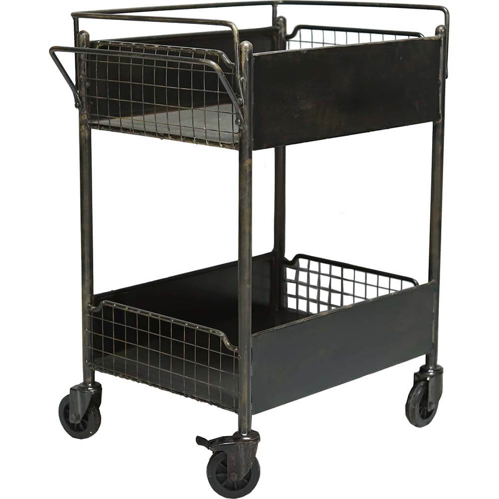 Tulane rullevogn med høje kanter er en robust og stilfuld industriel vogn i jern, perfekt til opbevaring og transport i hjemmet, køkkenet eller på caféen. Med høje kanter for sikkerhed, to rummelige hylder og store hjul for nem mobilitet. Mål: H: 87 cm x B: 66 cm x D: 46 cm. Hvert eksemplar er unikt i farve og finish.