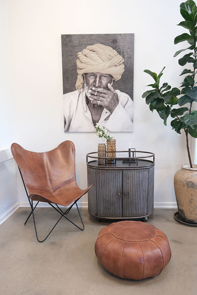 Denne stilfulde Alfredo runde læderpuf i antikbrun er en klassisk fortolkning af den marokkanske pudestil, der tilføjer et touch af vintage charme og komfort til dit hjem. Fremstillet i ægte brunt læder med markante syninger, der understreger det håndværksmæssige udtryk, og fyldt med genbrugsbomuld for en blød og støttende siddeoplevelse. Som et naturprodukt har hver puf unikke variationer i farve, tekstur og overflade – små ridser og ar er naturlige og bidrager til det autentiske look. Med dimensioner på H: 27 cm, B: 60 cm, D: 60 cm kan den bruges alsidigt som siddemøbel, fodskammel eller som et hyggeligt sofabord ved at placere en rund bakke ovenpå. Perfekt til at skabe en varm og indbydende atmosfære i stuen, soveværelset eller entreen – en tidløs favorit, der kombinerer funktionalitet med elegant design!