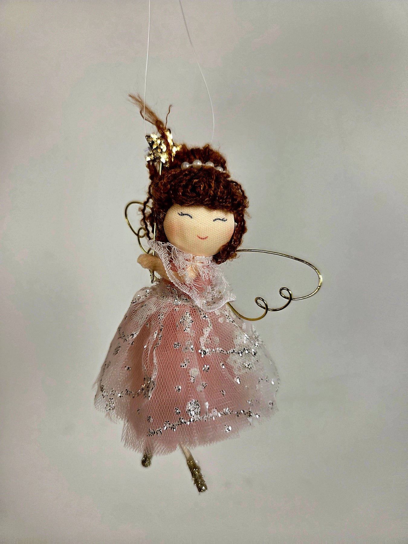 Disse fortryllende julefeer er det perfekte pynt til at tilføje en magisk og eventyrlig stemning til dit juletræ eller hjem. Håndlavet med fine detaljer som blødt stof i ansigt og kjole, krøllet garnhår i brunlige toner, gyldne wire-vinger og en lille tryllestav med glitterstjerne, der giver et sødt og drømmende udtryk. Kjolerne er i lette, gennemsigtige materialer som tyl og blonde med glimmeraccents i nuancer af hvid, rosa og guld, der fanger lyset smukt. Med en hængesnor er de nemt at ophænge på træet, i vinduet eller som en del af en større dekoration – sættet inkluderer flere varianter for en varieret og charmerende samling. Ca. 10-15 cm høje, er de ideelle til både traditionel og romantisk julindretning, og vil bringe smil og fantasi ind i højtiden år efter år!