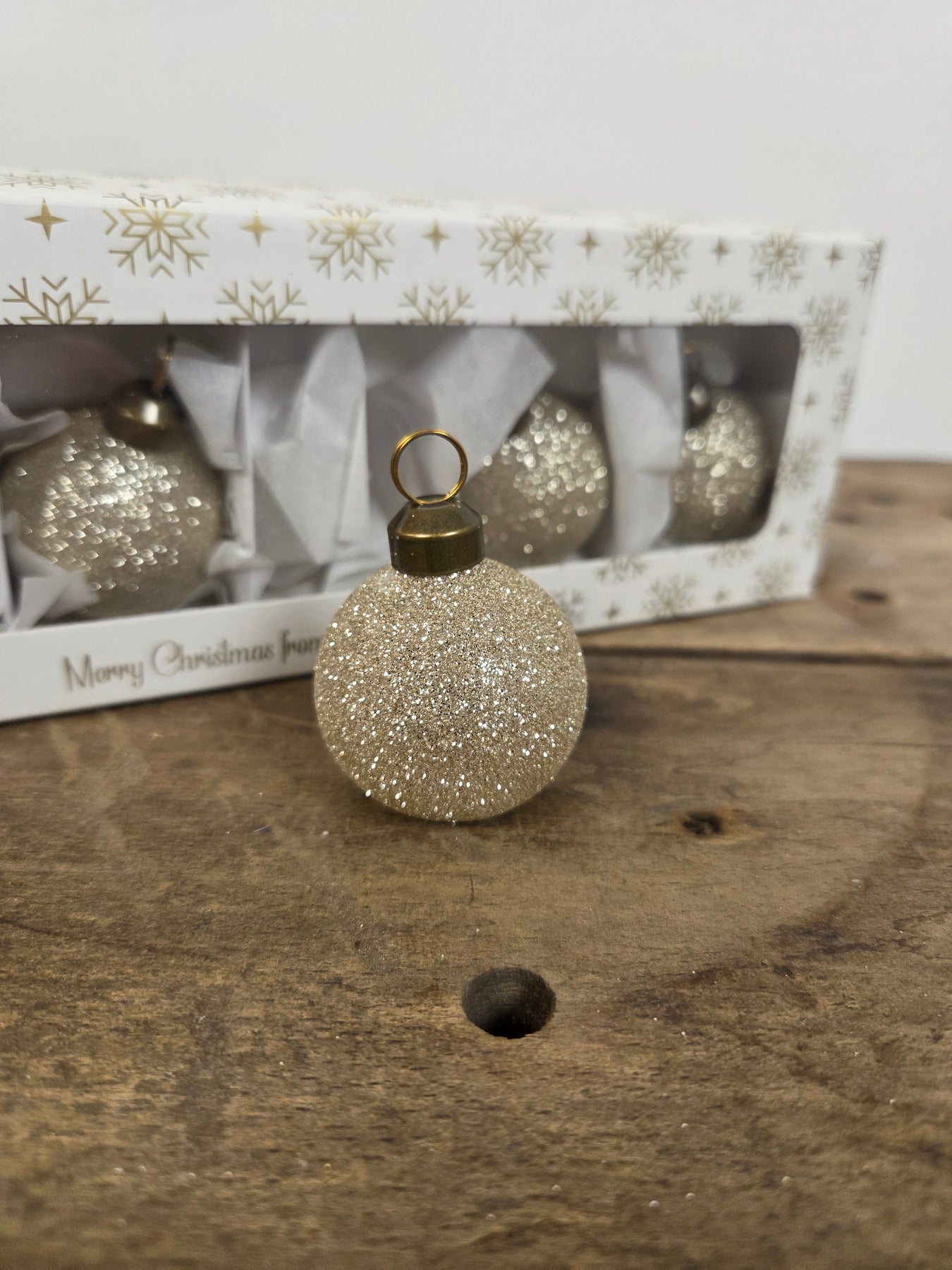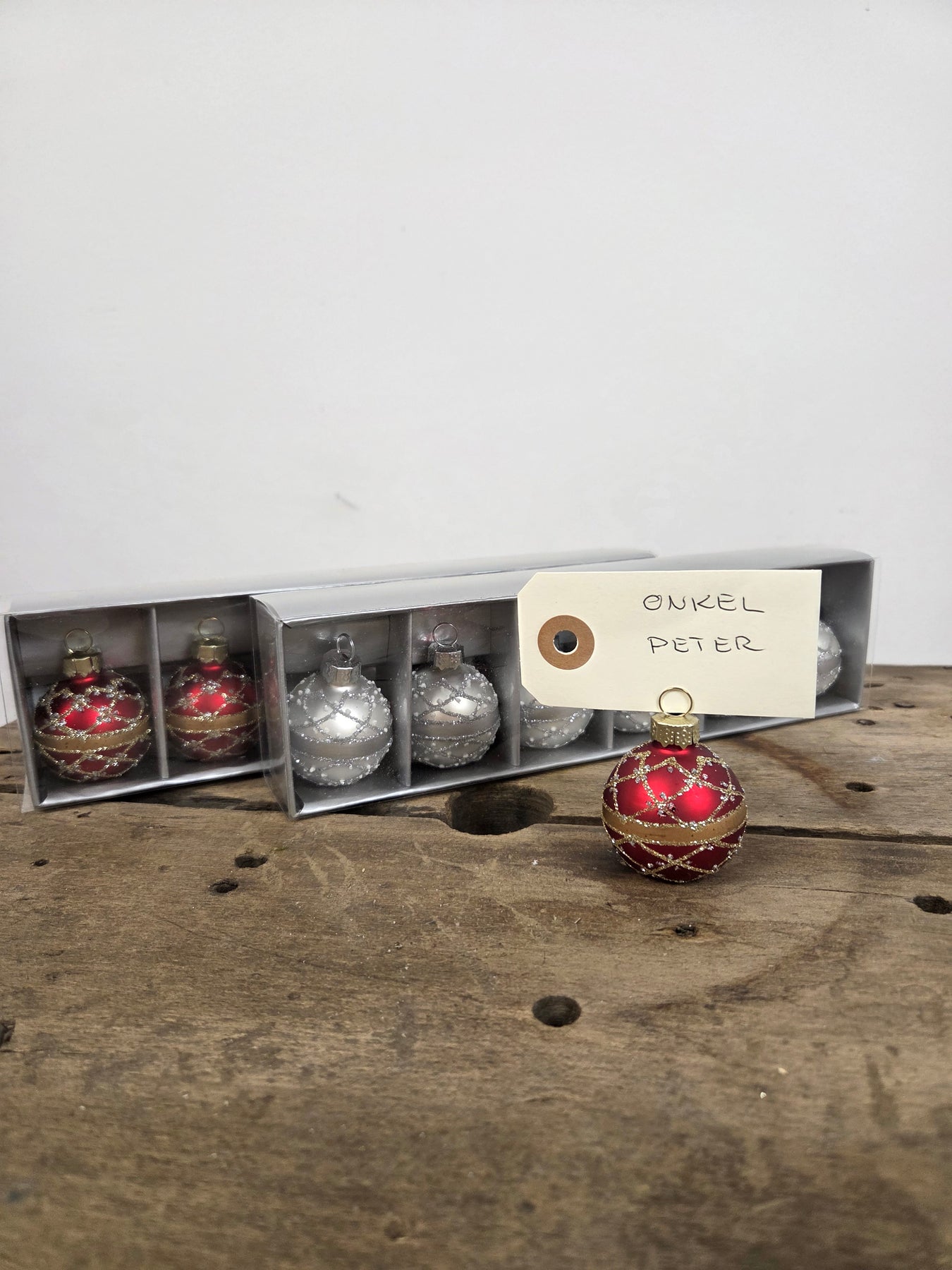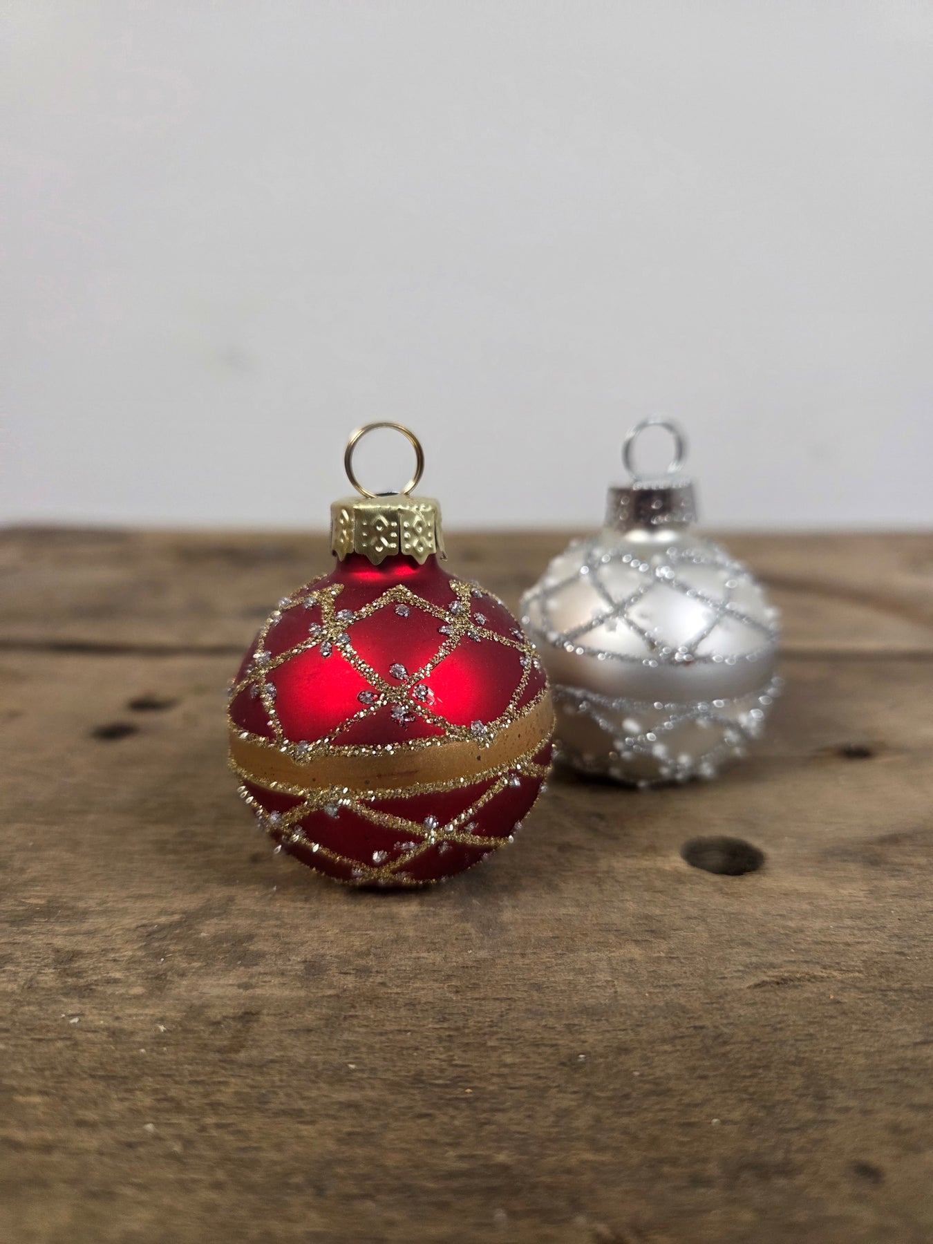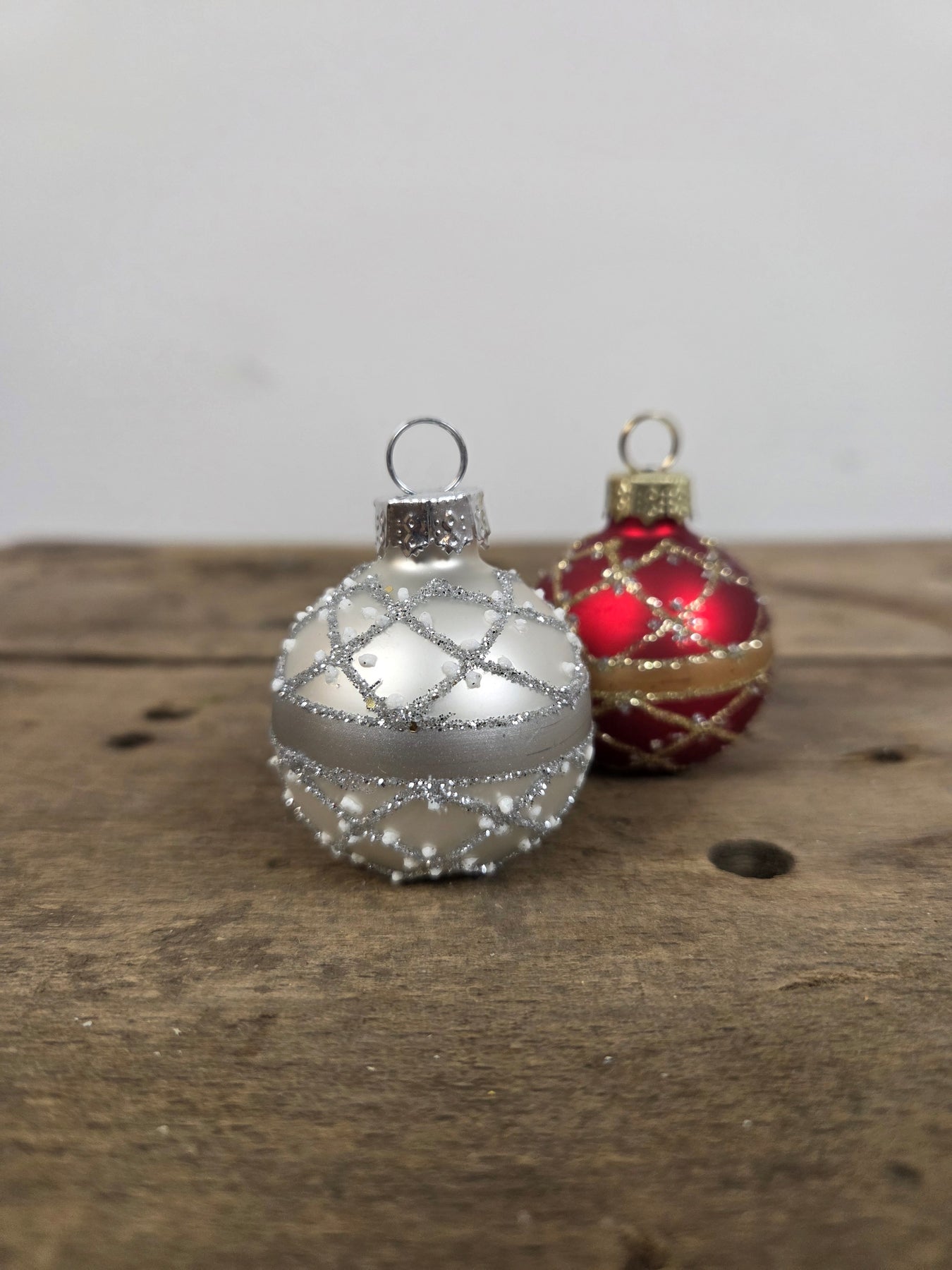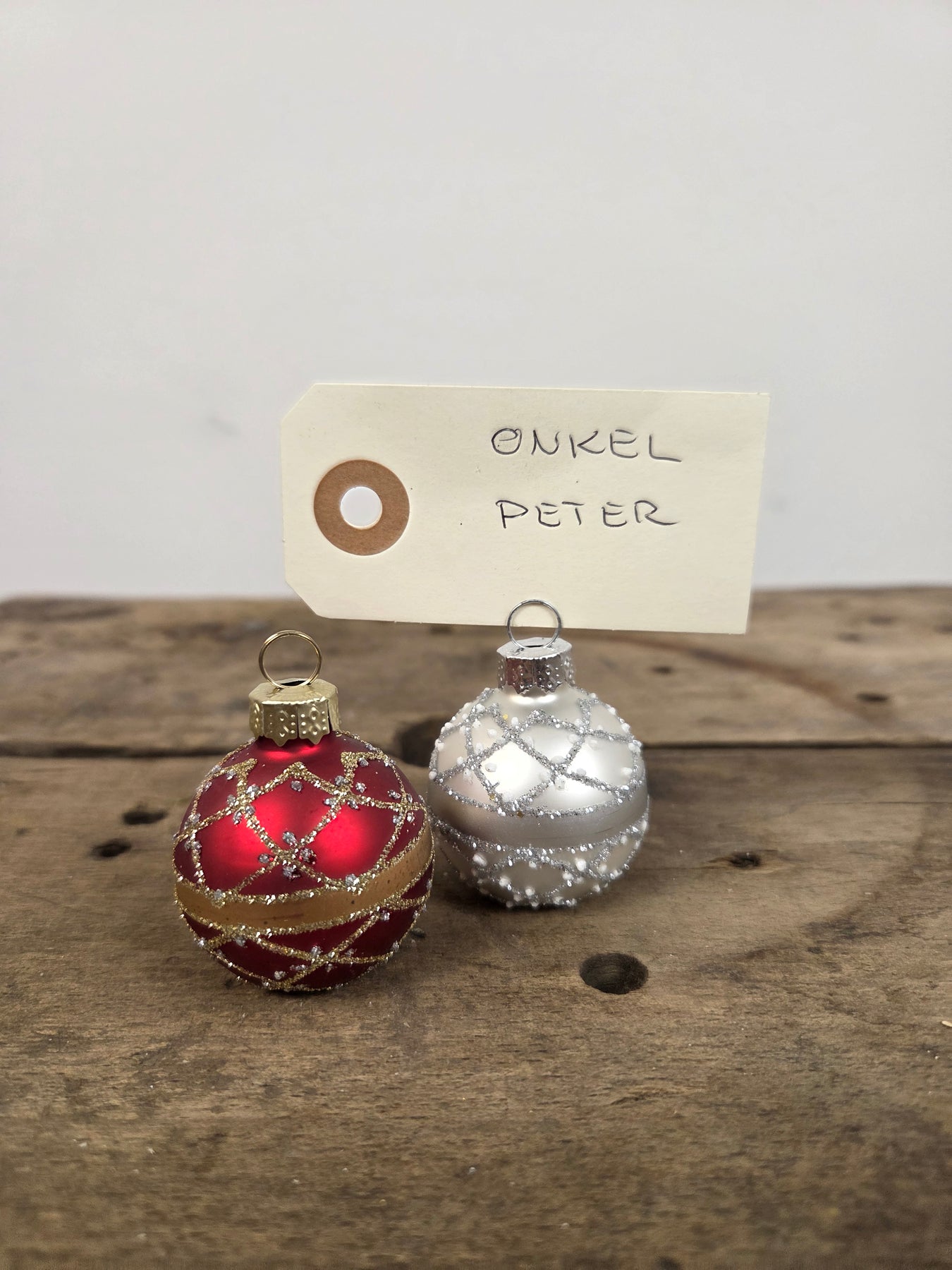 Disse søde julekugler er perfekte til at holde bordkortene på plads og gøre din julemiddag lidt mere festlig. De findes i smuk rød, sølv eller hvidguld med fint glitter og elegant mønster – og de er bare 4 cm store, så de er diskrete, men alligevel iøjnefaldende.