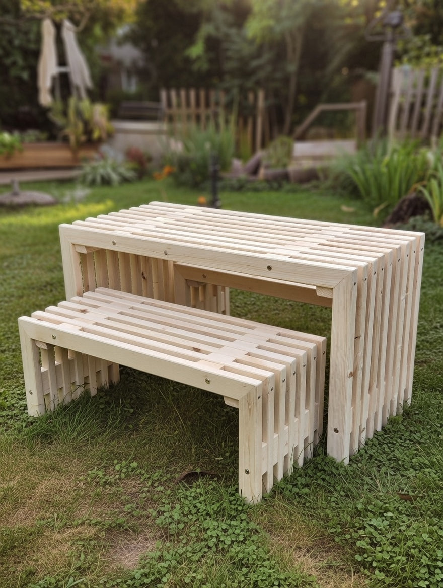 Det robuste design fra trallerne gør sættet ekstra holdbart – bygget til at tåle daglig leg, måltider under åben himmel og små eventyr år efter år. Træets naturlige styrke kombineret med en god efterbehandling (olie eller bejdse) sikrer lang levetid og modstandsdygtighed mod vind og vejr.