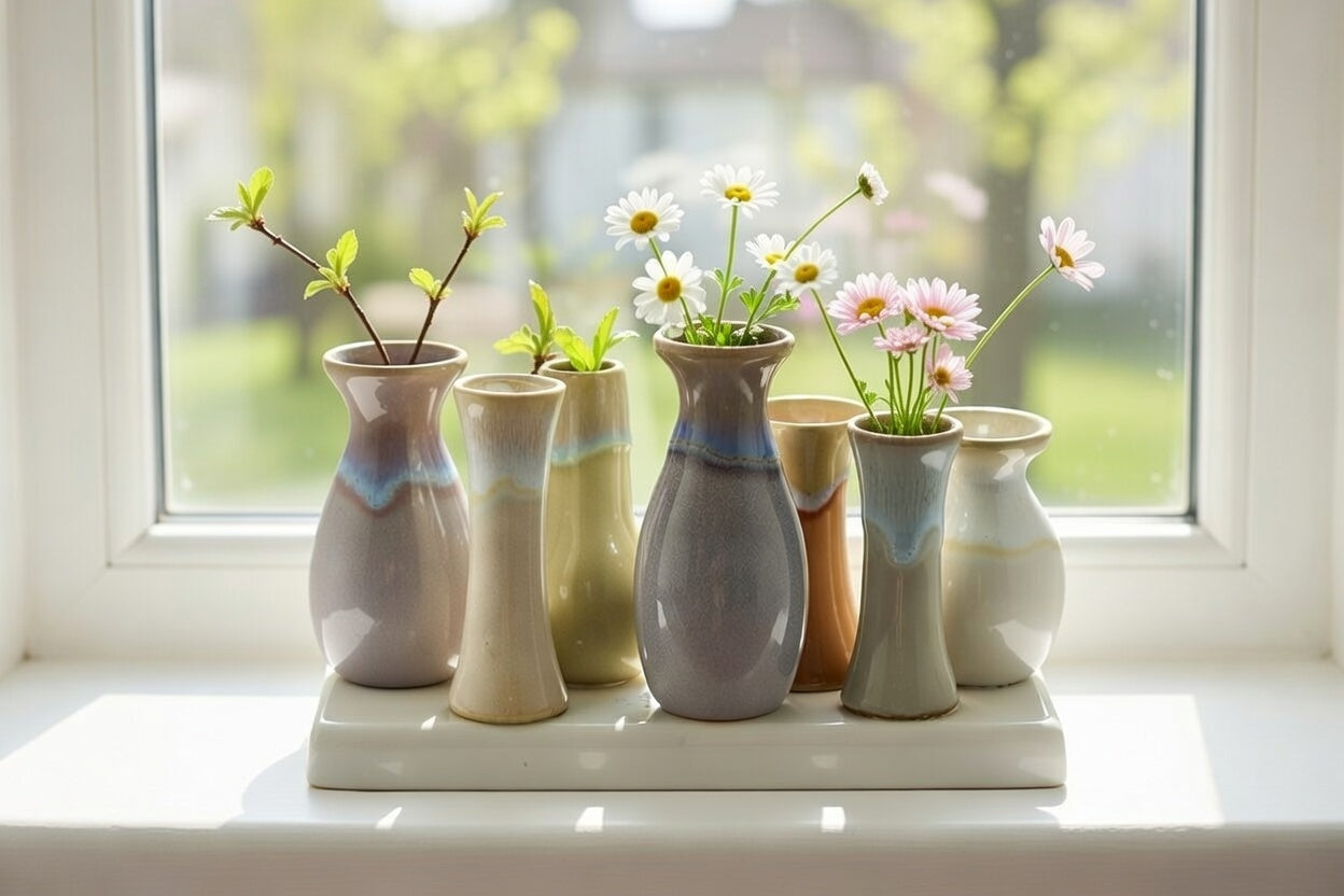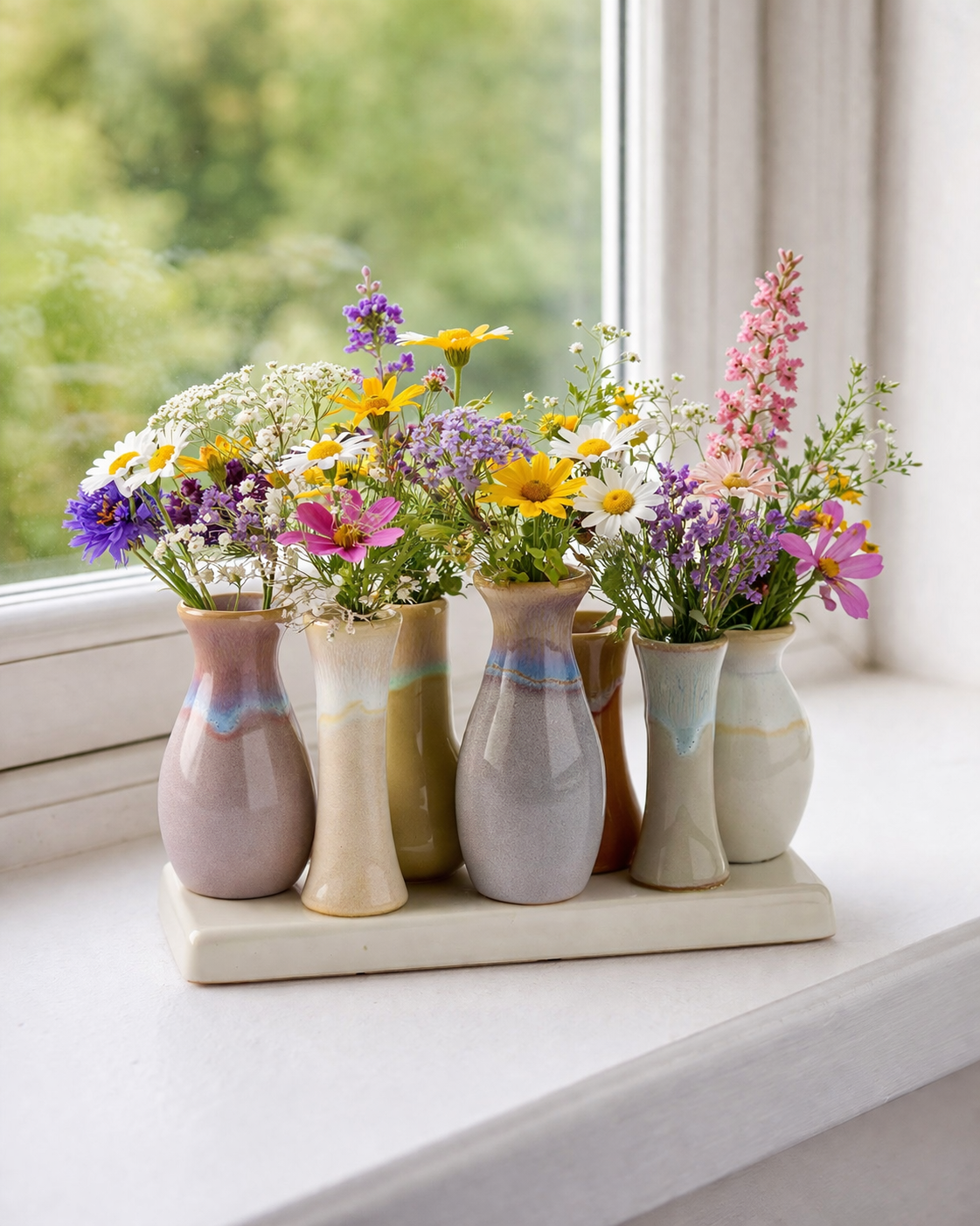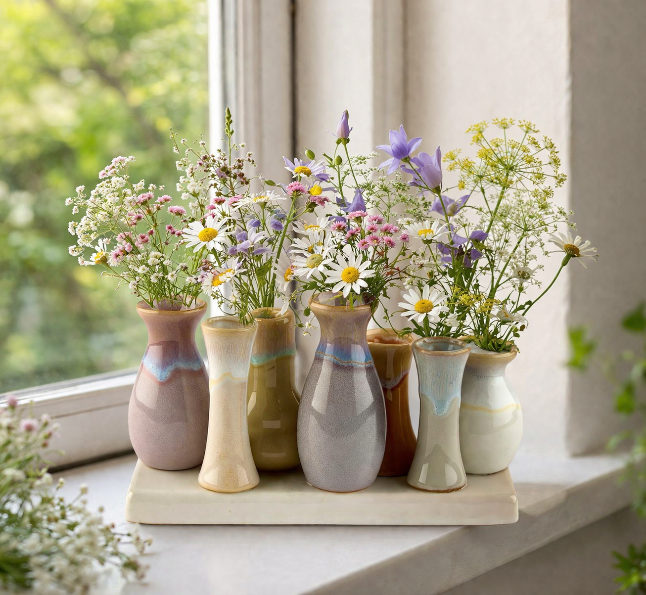 Disse små vaser i keramik er en smuk og harmonisk måde at samle flere blomster eller grene på samme tid. De består af otte forskellige former – fra slanke flasker til bløde buede og åbne tragte – der står tæt samlet på en rektangulær base. Glasuren i bløde, organiske jord- og pastelfarver med fine overgange i blågrå, beige, brun, lavender og cremet nuancer giver et naturligt, næsten flydende udtryk, der passer perfekt til nordisk, minimalistisk eller boheme-inspireret indretning.