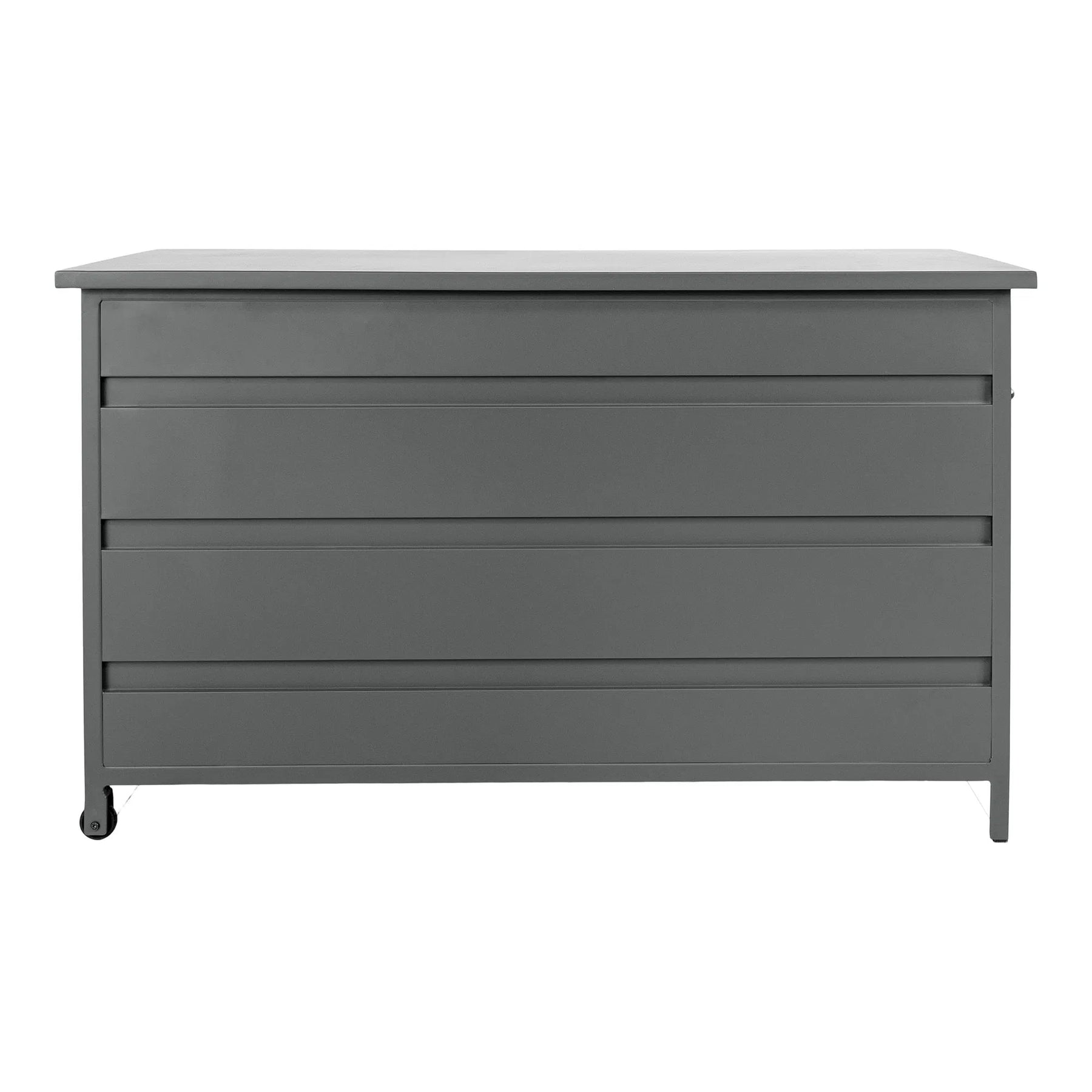 Boksen er fremstillet i robust aluminium i en flot grå nuance, der passer diskret ind i de fleste udendørsmiljøer. Den har et rent, minimalistisk design med glatte fronter og en solid konstruktion. Låg med gasdæmpere åbner let og bliver sikkert i åben position, så du nemt kan tage hynder ud eller lægge dem ind. Boksen står på hjul, hvilket gør den mobil og let at flytte rundt på terrassen eller ind under tag når vejret skifter.