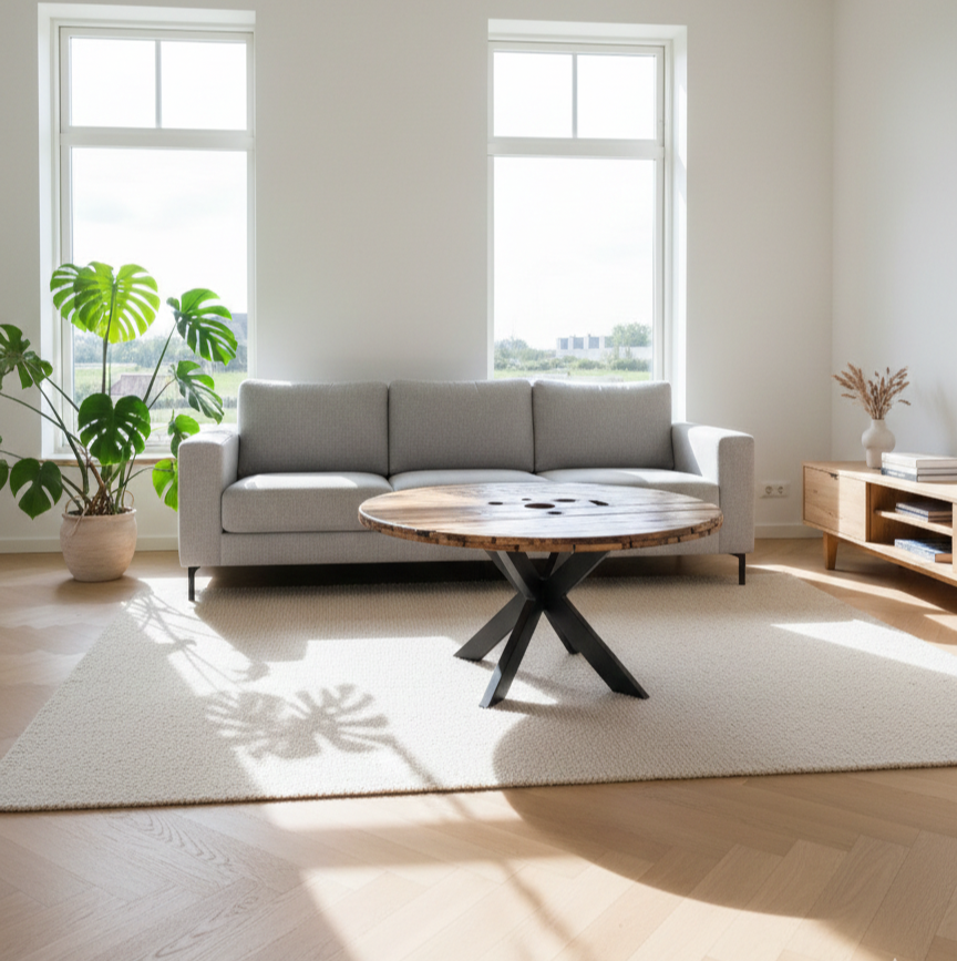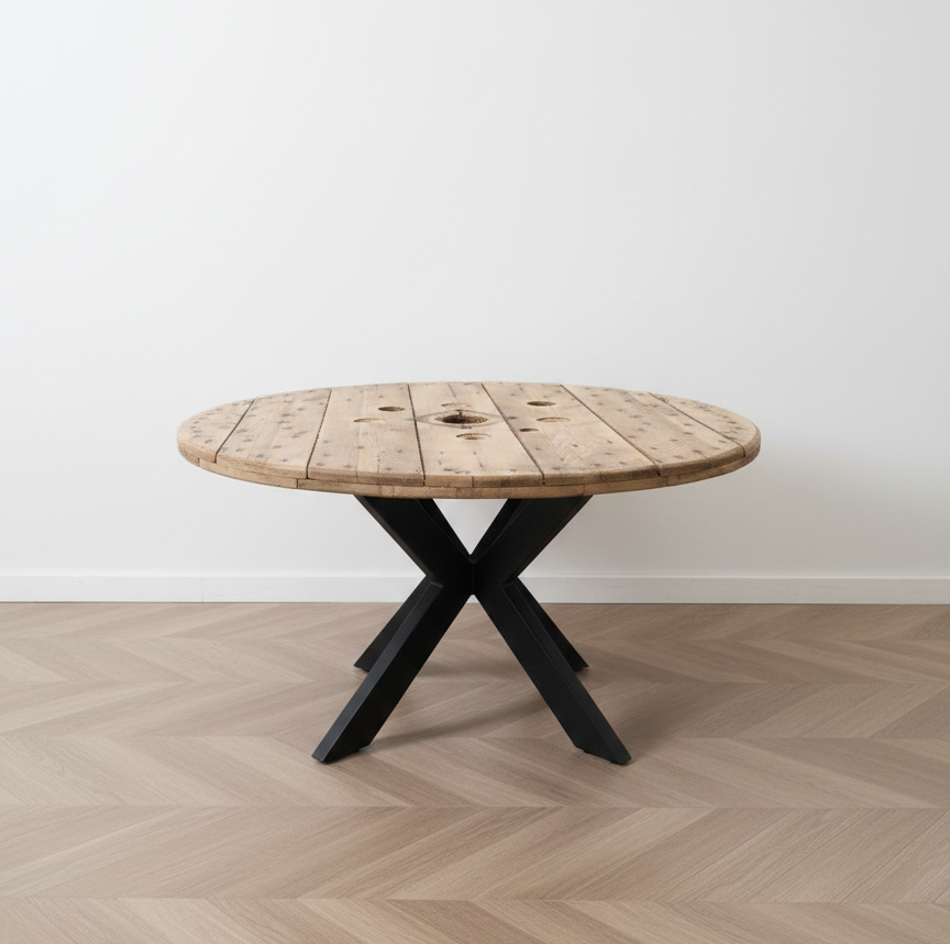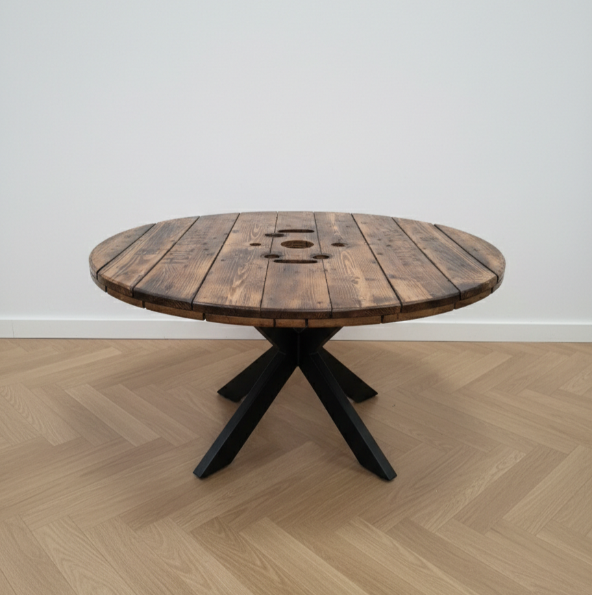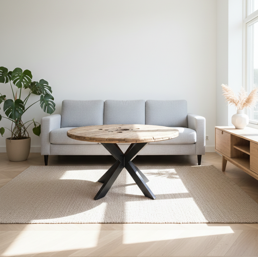 Vores sofaborde af kabeltromleplader giver et rå og industrielt look der passer godt ind i den nordiske stil og indretning. Den runde form gør bordet perfekt til hjørnesofa eller U sofaer.