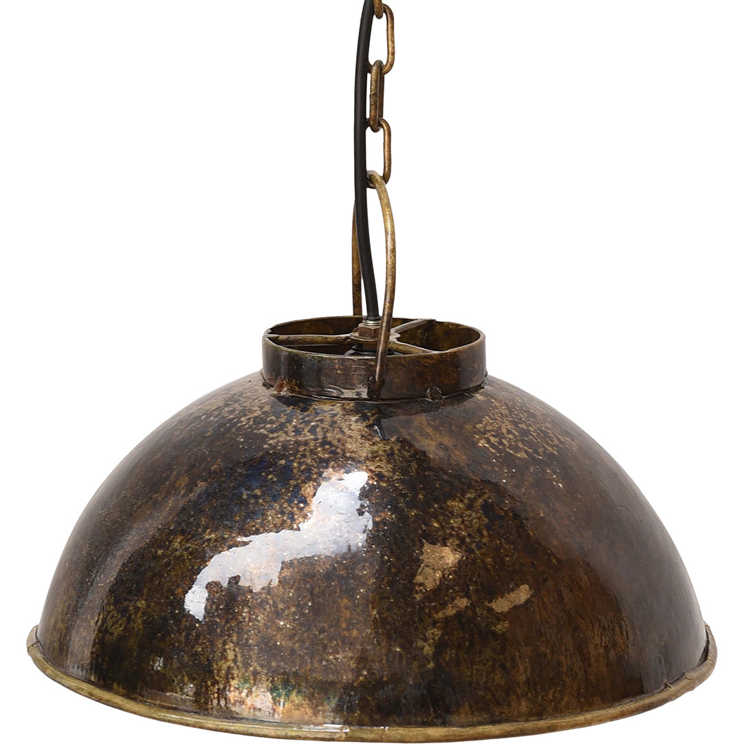 Med en diameter på ca. 30 cm og højde på 20 cm skaber den lille halvkugleformede skærm et blødt, fokuseret lysfald direkte nedad – ideelt til hyggekroge eller som accentbelysning. Den store E27-fatning giver frihed til at vælge pære efter stemning, fra varm glød til mere dæmpet lys. Lampen leveres med matchende kæde og ophæng samt sort ledning, der understreger det robuste, håndværksprægede udtryk.