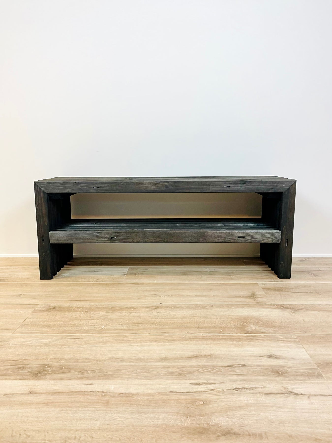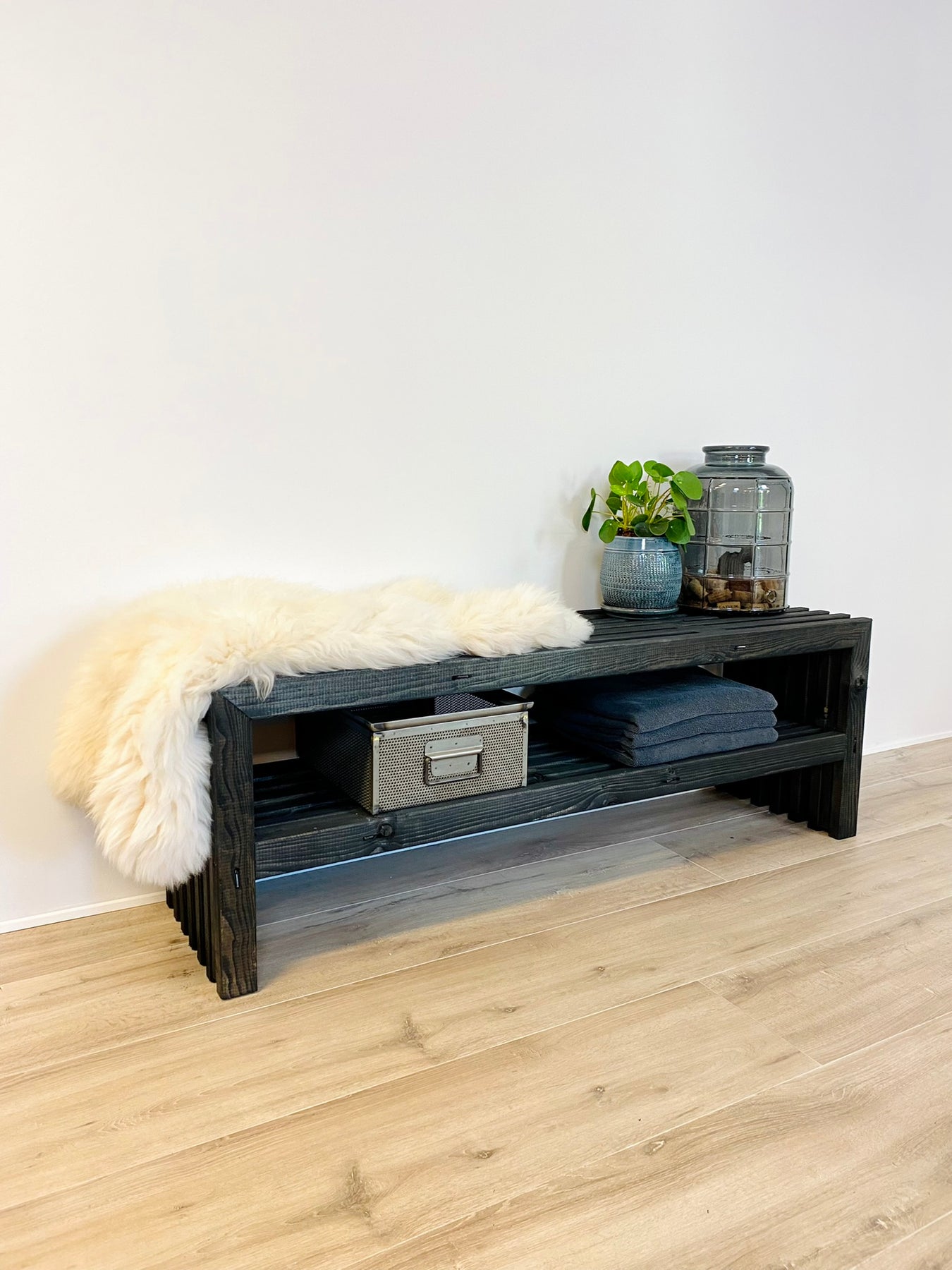 Dette stilrene TV-bord er håndbygget i Danmark af rigtige traller i massivt træ. Overfladen er behandlet med dyb sort bejdse, som fremhæver trallernes karakteristiske, lodrette liste-udtryk og giver et moderne, grafisk look med rå elegance.