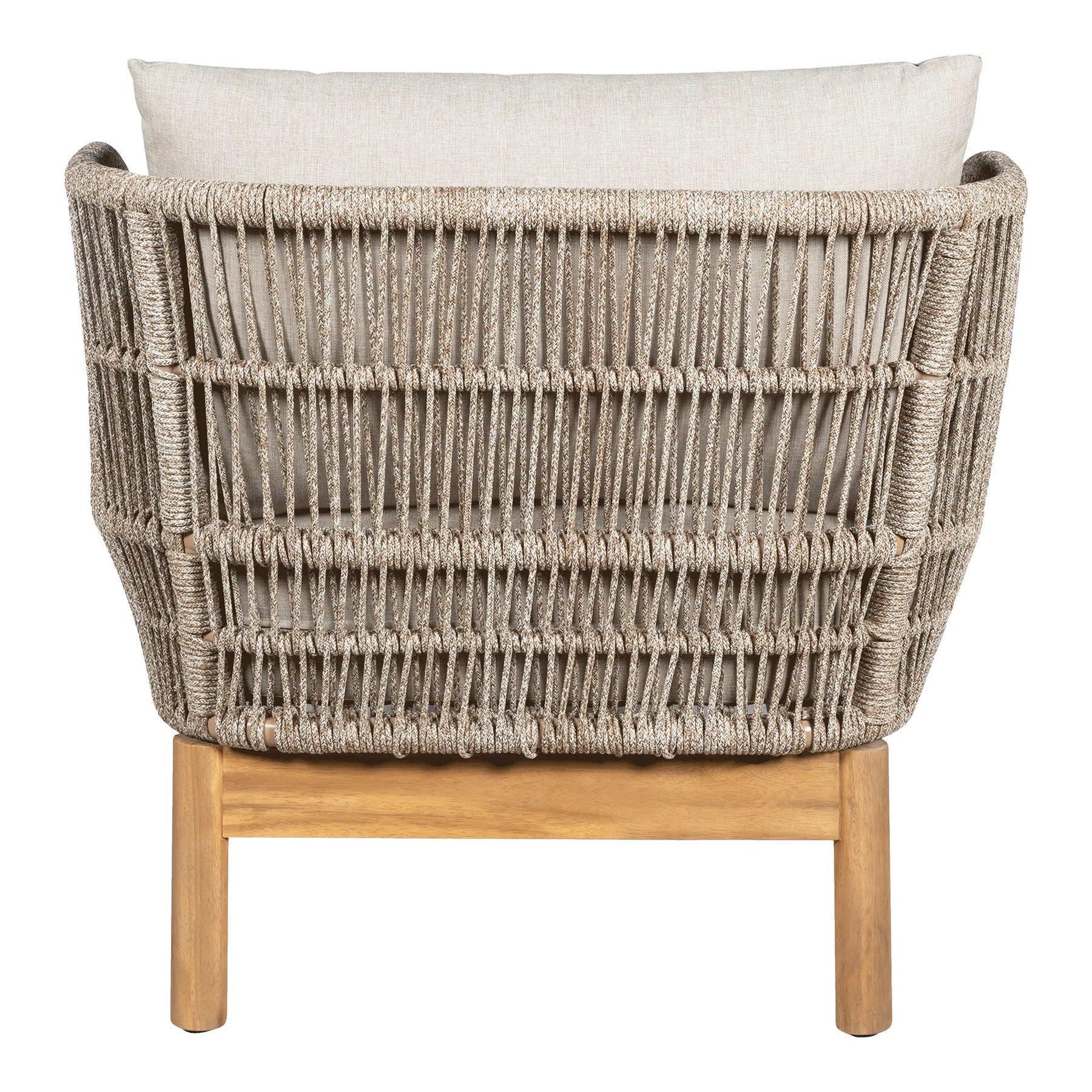 Verona-serien bringer en elegant og tidløs stemning til din udendørs lounge-område med et harmonisk design, der kombinerer naturlige materialer og moderne komfort. Møblerne er bygget op omkring en solid ramme i teaktræ, som giver både stabilitet og et varmt, naturligt udtryk. De bløde former er omkranset af slidstærkt, vævet reb i neutral beige tone, der skaber et let og luftigt look, mens de dybe, polstrede hynder i lys beige stof inviterer til afslapning.